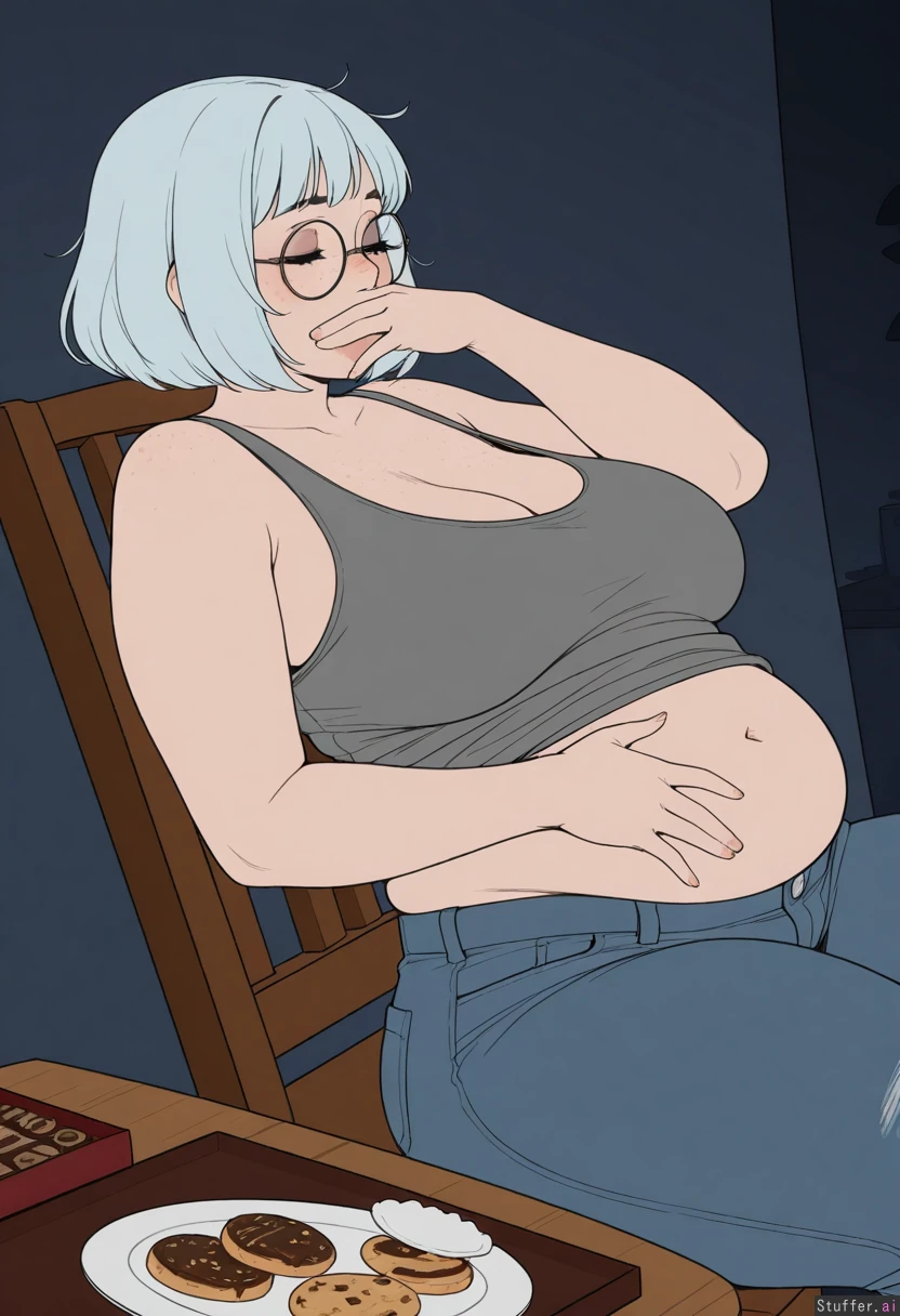 ((artist)), ((simple style)), (less detail), ((flat colors)), color, tall woman, 1girl, (dark room), (sagging breasts), (large breasts:1.1), cleavage, (Sitting on wooden chair), (plates of chocolate donuts and cookies on table:1.25), leaning back, (next to table), (side view), looking down, head back, ((Hand over mouth)), crumbs, hand on belly, (Grey tanktop), (low rise jeans), ((Light_blue hair), wavy bob, medium hair, bangs), round glasses, face, (face freckles), (body freckles), cute round black eyes, ((eyes closed)), nice eyelashes, eyeshadow, (double chin), (thick thighs:1.25), (belly), Chubby cheeks, blushing, round face, low brow, bored, ((tired)), (luscious big lips), (smile)