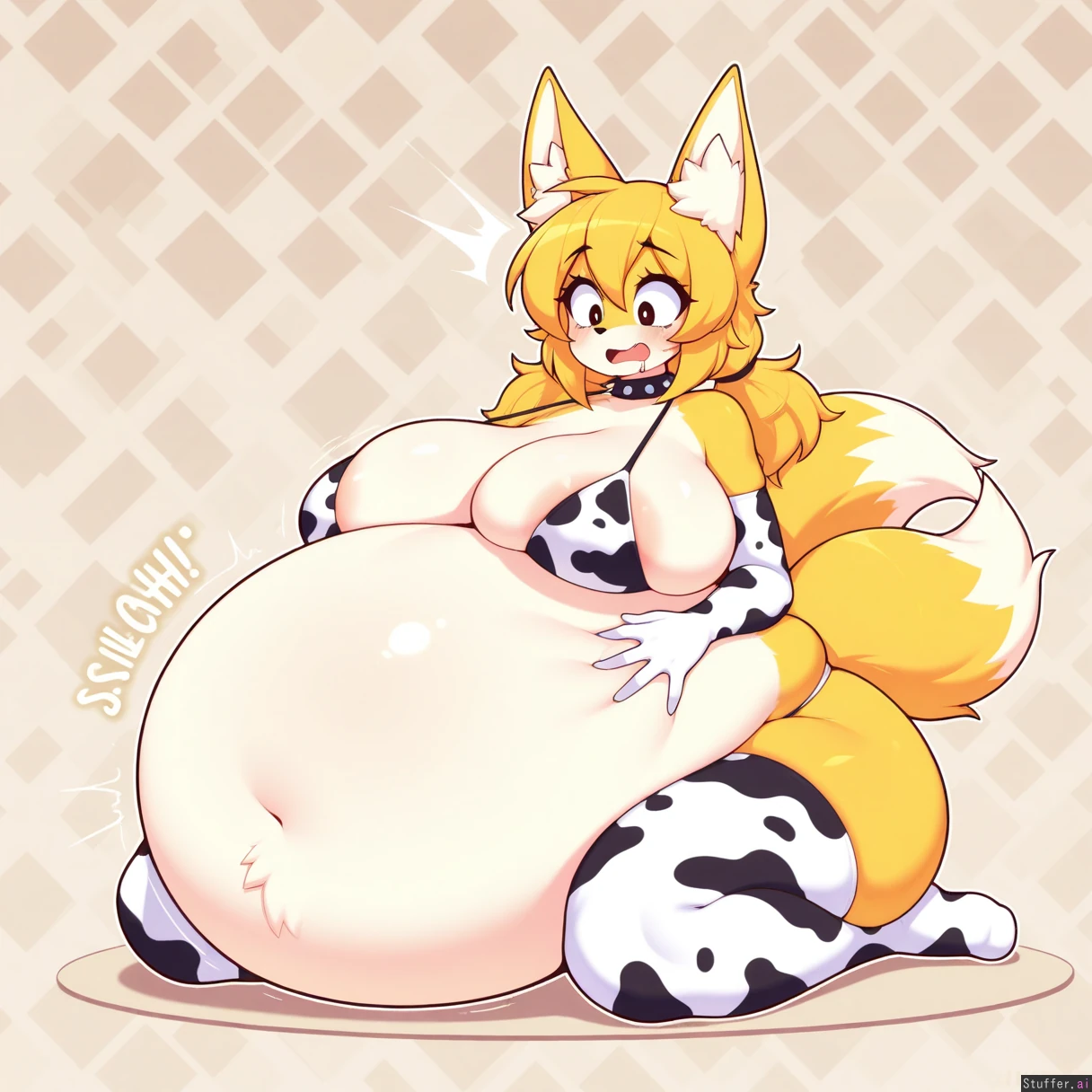 Fizintine(artist), best quality, skindentation, thick lines, white outline, 1girl, ((Anthro fox, yellow fur, obese)), (female tails the fox from sonic), cow print spiked thigh highs white gloves,(alone), solo anthro girl, furry, fox with two tails, tails_(sonic), (fox_snout), front_view, short woman, giant green jellow, ((sitting on jello background)), green jello world background, long messy hair, flaky hair, yellow pigtails hair, white belly fur, areolae, cow print bikini, paws, white pupils, in giant green jello world, standing sitting, holding belly, white chest fur, cute fang, about to vomit, ((blushing, surprised by someone walking in behind her, wincing eyes, belly fur, black mascara, runny mascara, spiked choker)) vore belly, looking down wide, wide eyes, scared, shocked, spiting, ((stomach noises, digestion sounds, drooling)), sitting on floor, deep cleavage, breast melting on top of belly, (soft belly, soft skin:1.2), hand on belly, hiccupping, cow_print_bra, over stretched clothing, gigantic ass, thin arms, thin thighs, ((gigantic belly:1.9)), (((round belly))), belly on floor, belly_between_legs, skindentation ((gigantic white furry breast, fat belly, gigantic ass:1.3)), ass_visible_from_front, laying down