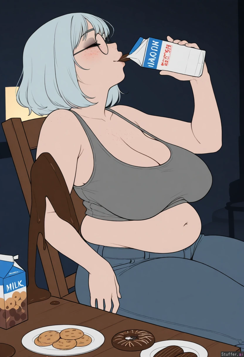 ((artist)), ((simple style)), (less detail), ((flat colors)), color, tall woman, 1girl, (dark room), (sagging breasts), (large breasts:1.1), cleavage, (Sitting on wooden chair), (plates of chocolate donuts and cookies on table:1.25), leaning back, (next to table), ((side view)), (head back), ((Holding milk carton in mouth)), drinking, gulping, (Grey tanktop), (low rise jeans), ((Light_blue hair), wavy bob, medium hair, bangs), round glasses, face, (face freckles), (body freckles), cute round black eyes, ((eyes closed)), nice eyelashes, eyeshadow, (double chin), (thick thighs:1.25), (belly), Chubby cheeks, blushing, round face, low brow, bored, ((tired)), (luscious big lips), (smile)
