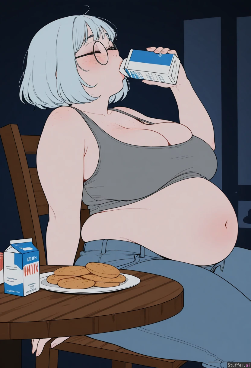 ((artist)), ((simple style)), (less detail), ((flat colors)), color, tall woman, 1girl, (dark room), (sagging breasts), (large breasts:1.1), bursting breasts, cleavage, (Sitting on wooden chair), (plates of donuts and cookies on table:1.25), leaning back, (next to table), ((side view)), (head back), ((Holding milk carton in mouth)), drinking, gulping, (Grey tanktop), (low rise jeans), (unbuttoned jeans), ((Light_blue hair), wavy bob, medium hair, bangs), round glasses, face, (face freckles), (body freckles), cute round black eyes, ((eyes closed)), nice eyelashes, eyeshadow, ((double chin)), (thick thighs:1.3), ((bloated belly)), ((overweight)), (Chubby cheeks), ((blushing)), (round face), low brow, bored, ((tired)), (luscious big lips), (smile)