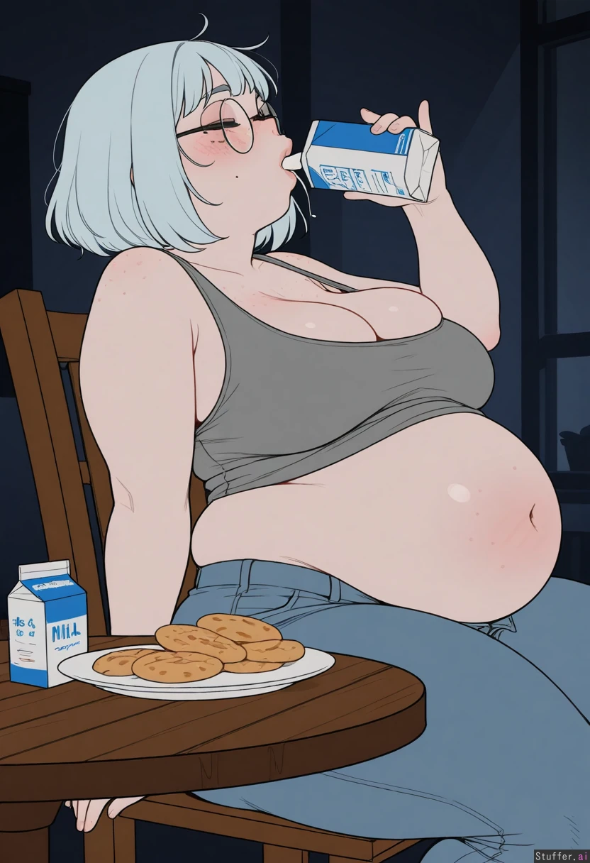 ((artist)), ((simple style)), (less detail), ((flat colors)), color, tall woman, 1girl, (dark room), (sagging breasts), (large breasts:1.1), bursting breasts, cleavage, (Sitting on wooden chair), (plates of donuts and cookies on table:1.25), leaning back, (next to table), ((side view)), (head back), ((Holding milk carton in mouth)), drinking, gulping, (Grey tanktop), (low rise jeans), (unbuttoned jeans), ((Light_blue hair), wavy bob, medium hair, bangs), round glasses, face, (face freckles), (body freckles), cute round black eyes, ((eyes closed)), nice eyelashes, eyeshadow, ((double chin)), (thick thighs:1.3), ((bloated belly:1.3)), ((overweight)), ((Chubby cheeks)), ((blushing)), (round face), low brow, bored, ((tired)), (luscious big lips), (smile), ((exhausted)), bags under eyes