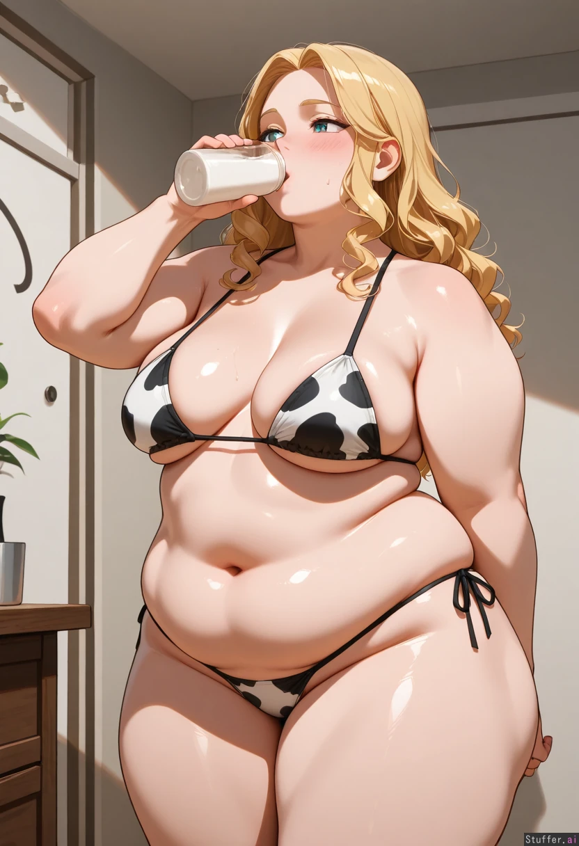 A thicc girl with huge, fat arms and round medium breasts, a thick waist and love handles, long, thick legs, drinking milk, wearing sexy cowprint clothes, blushing, sexy, with very long, curly wavy cascading blonde hair. Stocky swollen fertile girthy feminine sexy body, healthy obese, sexy overweight, round supple taught smooth subcutaneous body fat curves, fully engorged,
