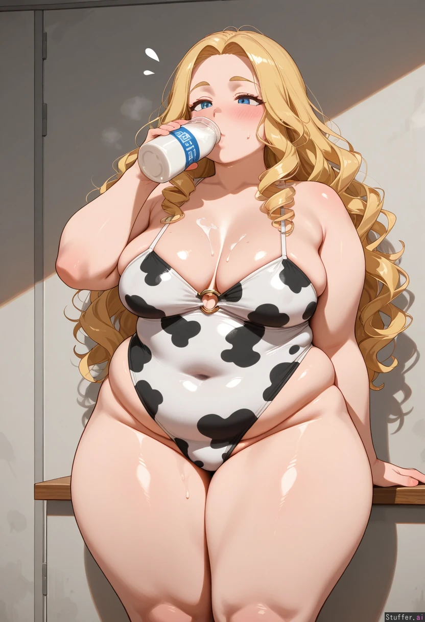 A thicc girl with huge, fat arms and round medium breasts, a thick waist and love handles, long, thick legs, drinking milk, wearing sexy cowprint clothes, blushing, sexy, with very long, curly wavy cascading blonde hair. Stocky swollen fertile girthy feminine sexy body, healthy obese, sexy overweight, round supple taught smooth subcutaneous body fat curves, fully engorged,