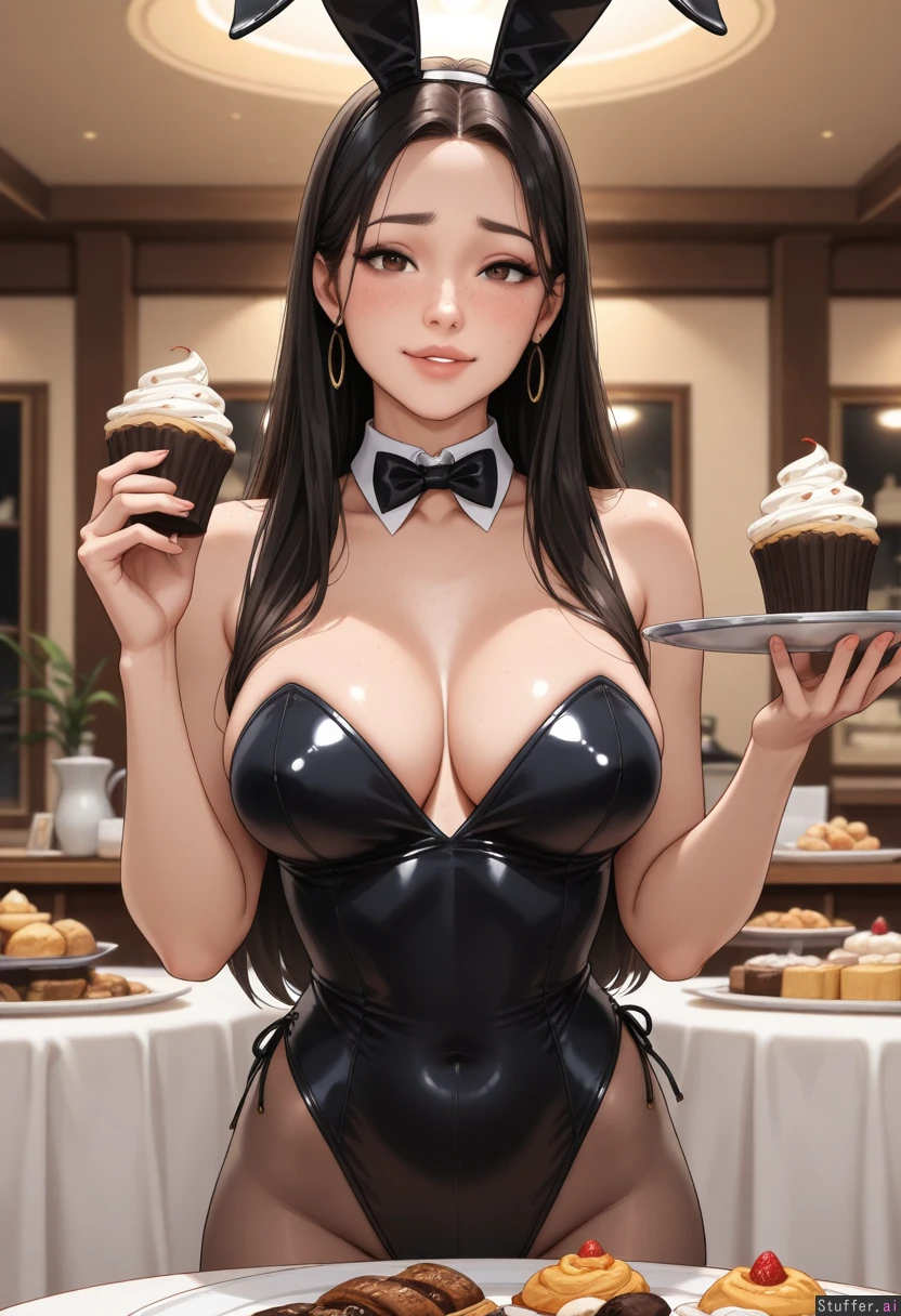 **base** (best quality), (high rating), absurd res, high res, detailed, ultra quality, ((high quality)), masterpiece, (ultra high resolution), stunning beauty, detailed face, intricate detail, sophisticated detail, exquisite detail, perfect 2D art, realistic lighting, realistic shading, correct anatomy, 8k, (highly detailed face), highly detailed skin texture, 1girl, ((hyperrealistic, photorealistic)), (((detailed face))), ((solo)), **artists** Kittew(artist), aromasensei(artist), miyu(artist), albatrossart(artist), balecxi(artist), modeus14(artist), **appearance** brunette, (((Thai woman, Asian, brown_skin, asian_female, adult, 25 years old, freckles))), (((intricately detailed sexy expressive eyes, asian_eyes, brown eyes))), (((long straight hair, black hair))), sexy face, thin face, (((freckles, brown_skin))), (((expressive_face))), **clothes** (((Black playboy bunny outfit, bow tie))), **setting** at a restaurant, nighttime, warm lighting, mood lighting, low light, diffuse light, dim light, (detailed background, realistic background), ((many desserts on table, too much food, buffet)), **pose** (((expressive eyes))), (((raised eyebrows, holding a cupcake))), **body** (((Skinny, narrow_waist)))