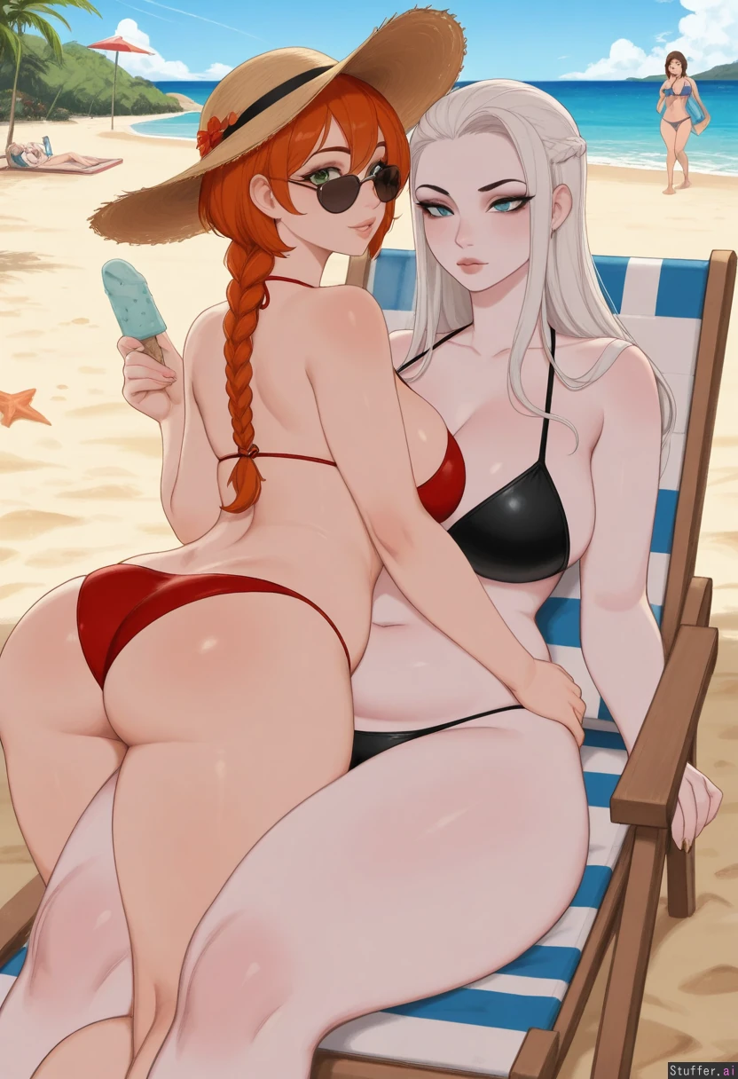 (attention to detail), (flat colors:1.1), , (bold details), (usa37107692:1.1), (pewbutt:1.1) ,(Kamii Momoru:1.2), (RockSolidArt:1.2) , (kittew:0.8), (reiq:0.8), (kipteitei:1.1), (sciamano240:1.1), (albatross:1.2), beach, redhead, brunette, thick_braid, bobcut, green_eyes, blue_eyes, yuri_couple, 2women, bisexual, bikini, bikini, swimsuit, thick_build, laying on a deckchair, sunglasses, hat, holding_ice_cream, chubby, girthy, fertile breedable feedee-breedees, chunky rounded bulked up weight gain, round fertile sexy bellies, thick fat arms, beefy arms, slightly inflated