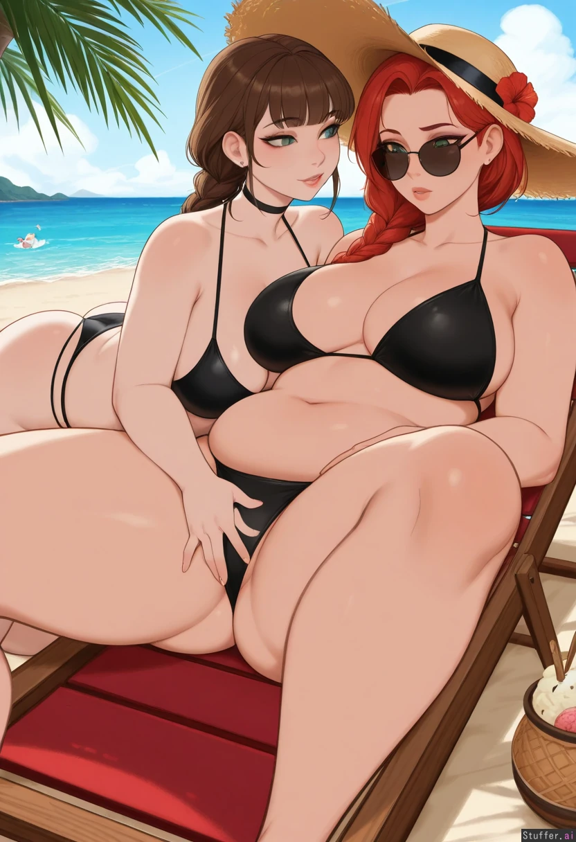 (attention to detail), (flat colors:1.1), , (bold details), (usa37107692:1.1), (pewbutt:1.1) ,(Kamii Momoru:1.2), (RockSolidArt:1.2) , (kittew:0.8), (reiq:0.8), (kipteitei:1.1), (sciamano240:1.1), (albatross:1.2), beach, redhead, brunette, thick_braid, bobcut, green_eyes, blue_eyes, yuri_couple, 2women, bisexual, bikini, bikini, swimsuit, thick_build, laying on a deckchair, sunglasses, hat, holding_ice_cream, chubby, girthy, fertile breedable feedee-breedees, chunky rounded bulked up weight gain, round fertile sexy bellies, thick fat arms, beefy arms, slightly inflated