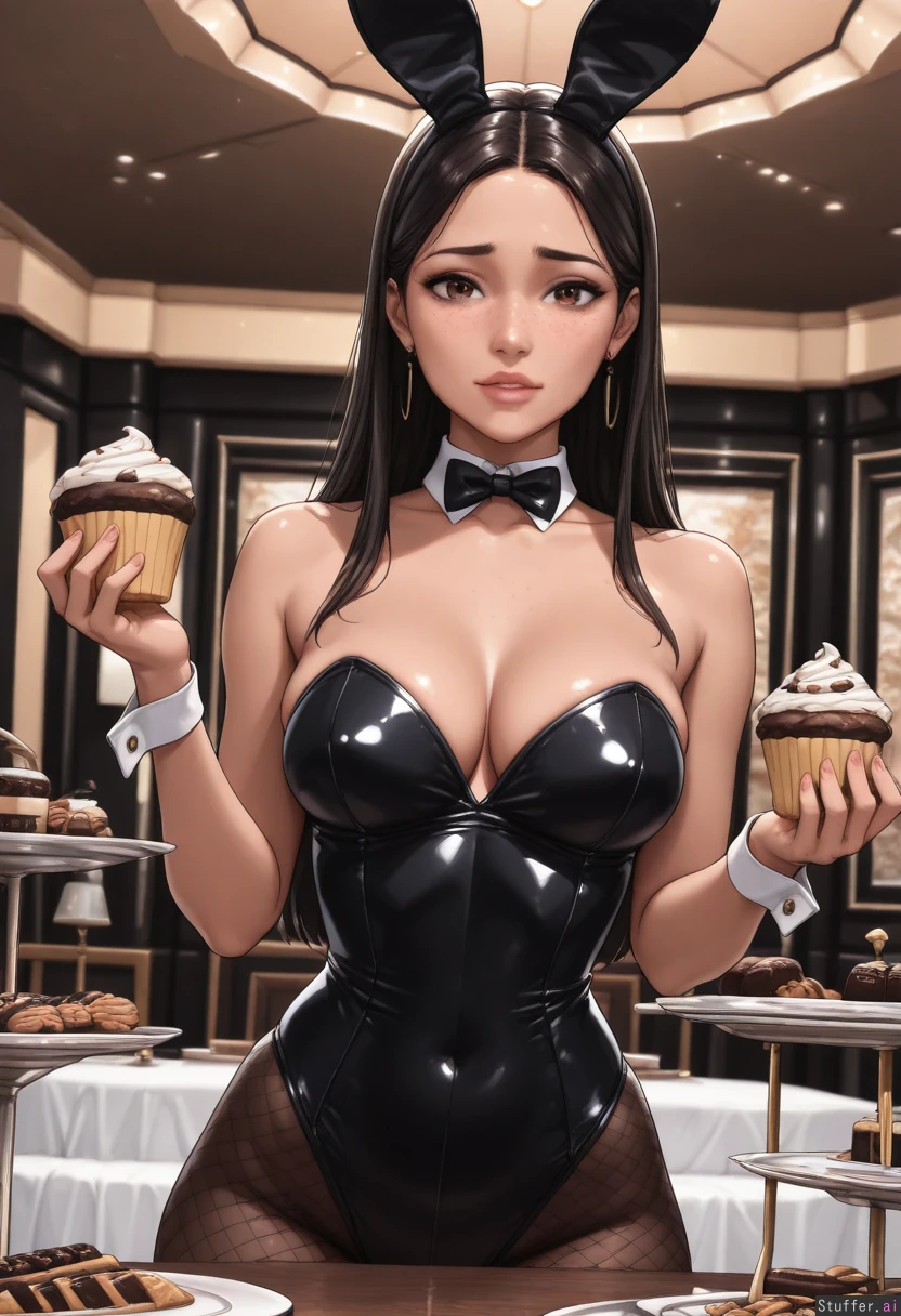 **base** (best quality), (high rating), absurd res, high res, detailed, ultra quality, ((high quality)), masterpiece, (ultra high resolution), stunning beauty, detailed face, intricate detail, sophisticated detail, exquisite detail, perfect 2D art, realistic lighting, realistic shading, correct anatomy, 8k, (highly detailed face), highly detailed skin texture, 1girl, ((hyperrealistic, photorealistic)), (((detailed face))), ((solo)), **artists** Kittew(artist), aromasensei(artist), miyu(artist), albatrossart(artist), balecxi(artist), modeus14(artist), **appearance** brunette, (((Thai woman, Asian, dark_skin, brown_skin, asian_female, adult, 25 years old, freckles))), (((intricately detailed sexy expressive eyes, asian_eyes, brown eyes))), (((long straight hair, black hair))), sexy face, thin face, (((freckles, brown_skin, dark_skin))), (((expressive_face))), **clothes** (((Black playboy bunny outfit, bow tie))), **setting** at a restaurant, nighttime, warm lighting, mood lighting, low light, diffuse light, dim light, (detailed background, realistic background), ((many desserts on table, too much food, buffet)), **pose** (((raised eyebrows, holding a cupcake))), **body** (((Skinny, narrow_waist)))