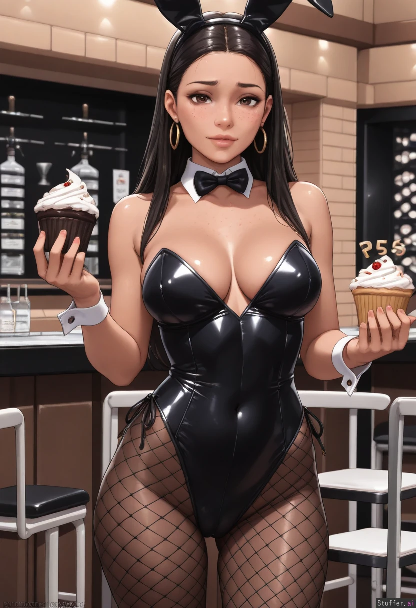 **base** (best quality), (high rating), absurd res, high res, detailed, ultra quality, ((high quality)), masterpiece, (ultra high resolution), stunning beauty, detailed face, intricate detail, sophisticated detail, exquisite detail, perfect 2D art, realistic lighting, realistic shading, correct anatomy, 8k, (highly detailed face), highly detailed skin texture, 1girl, ((hyperrealistic, photorealistic)), (((detailed face))), ((solo)), **artists** Kittew(artist), aromasensei(artist), miyu(artist), albatrossart(artist), balecxi(artist), modeus14(artist), **appearance** brunette, (((Thai woman, Asian, dark_skin, brown_skin, asian_female, adult, 25 years old, freckles))), (((intricately detailed sexy expressive eyes, asian_eyes, brown eyes))), (((long straight hair, black hair))), sexy face, thin face, (((freckles, brown_skin, dark_skin))), (((expressive_face))), **clothes** (((Black playboy bunny outfit, bow tie))), **setting** at a restaurant, nighttime, warm lighting, mood lighting, low light, diffuse light, dim light, (detailed background, realistic background), **pose** (((raised eyebrows, holding a cupcake))), **body** (((Skinny, narrow_waist)))