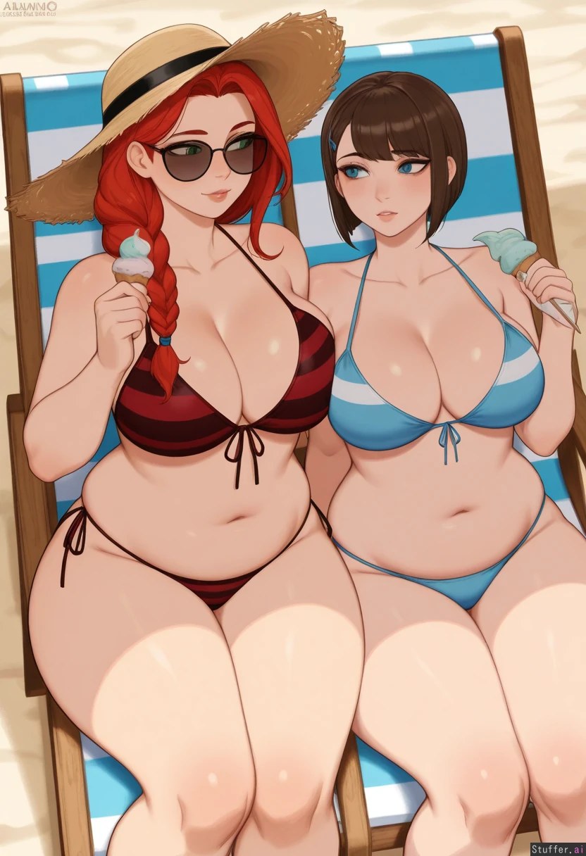 (attention to detail), (flat colors:1.1), , (bold details), (usa37107692:1.1), (pewbutt:1.1) ,(Kamii Momoru:1.2), (RockSolidArt:1.2) , (kittew:0.8), (reiq:0.8), (kipteitei:1.1), (sciamano240:1.1), (albatross:1.2), beach, redhead, brunette, thick_braid, bobcut, green_eyes, blue_eyes, yuri_couple, 2women, bisexual, bikini, bikini, swimsuit, thick_build, laying on a deckchair, sunglasses, hat, holding_ice_cream, chubby, girthy, fertile breedable feedee-breedees, chunky rounded bulked up weight gain, round fertile sexy bellies, thick fat arms, beefy arms, slightly inflated