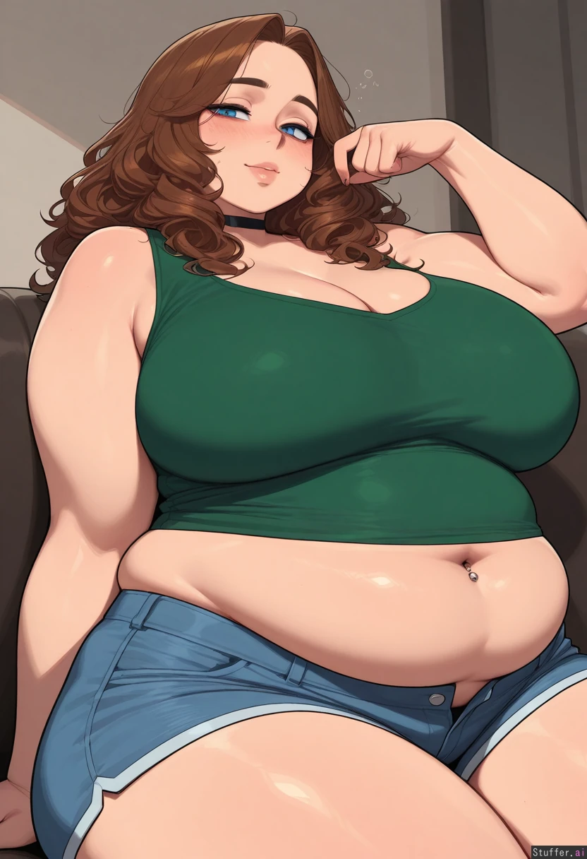 ((Gorgeous brunette college girl with wavy silky hair and steely blue eyes)), choker, unzipped shorts, navel piercing, (((midriff peek, thick hips, chubby belly, gotten fat, sexy arms, sexy))), (((helpless, drunk:1.3))), solo, high quality, krekkov(artist), KAMII MOMORU(artist), detailed face, (eyeliner, dramatic angle), couch Straddling viewer, sitting on viewer, pov sex