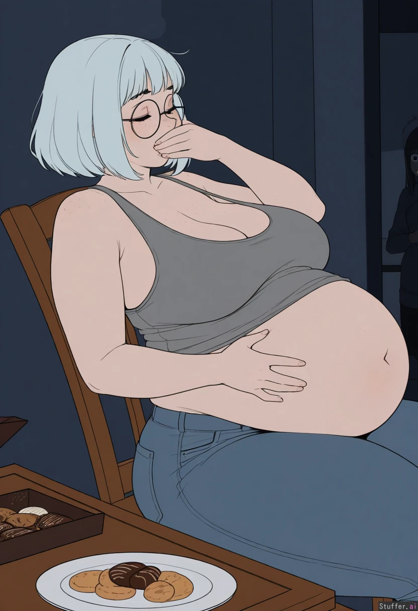 ((artist)), ((simple style)), (less detail), ((flat colors)), color, tall woman, 1girl, (dark room), (sagging breasts), (large breasts:1.1), cleavage, (Sitting on wooden chair), (plates of chocolate donuts and cookies on table:1.25), leaning back, (next to table), (side view), looking down, head back, ((Hand over mouth)), crumbs, hand on belly, (Grey tanktop), (low rise jeans), ((Light_blue hair), wavy bob, medium hair, bangs), round glasses, face, (face freckles), (body freckles), cute round black eyes, ((eyes closed)), nice eyelashes, eyeshadow, (double chin), (thick thighs:1.25), (huge belly), Chubby cheeks, blushing, round face, low brow, bored, ((tired)), (luscious big lips), (smile)