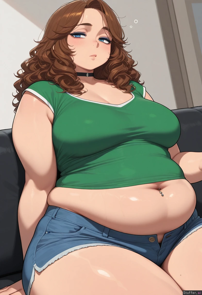 ((Gorgeous brunette college girl with wavy silky hair and steely blue eyes)), choker, unzipped shorts, navel piercing, (((midriff peek, thick hips, chubby belly, gotten fat, sexy arms, sexy, engorged medium breasts))), (((drowsy, tired:1.3))), solo, high quality, krekkov(artist), KAMII MOMORU(artist), detailed face, (eyeliner, dramatic angle), couch Straddling viewer, sitting on viewer, pov sex