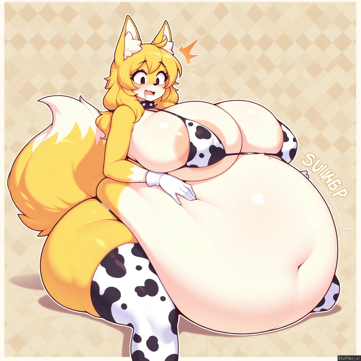 Fizintine(artist), best quality, skindentation, thick lines, white outline, 1girl, ((Anthro fox, yellow fur, obese)), (female tails the fox from sonic), cow print spiked thigh highs white gloves,(alone), solo anthro girl, furry, fox with two tails, tails_(sonic), (fox_snout), front_view, short woman, giant green jellow, ((sitting on jello background)), green jello world background, long messy hair, flaky hair, yellow pigtails hair, white belly fur, areolae, cow print bikini, paws, white pupils, in giant green jello world, standing sitting, holding belly, white chest fur, cute fang, about to vomit, ((blushing, surprised by someone walking in behind her, wincing eyes, belly fur, black mascara, runny mascara, spiked choker)) vore belly, looking down wide, wide eyes, scared, shocked, spiting, ((stomach noises, digestion sounds, drooling)), sitting on floor, deep cleavage, breast melting on top of belly, (soft belly, soft skin:1.2), hand on belly, hiccupping, cow_print_bra, over stretched clothing, gigantic ass, thin arms, thin thighs, ((gigantic belly:1.9)), (((round belly))), belly on floor, belly_between_legs, skindentation ((gigantic white furry breast, fat belly, gigantic ass:1.3)), ass_visible_from_front, laying down