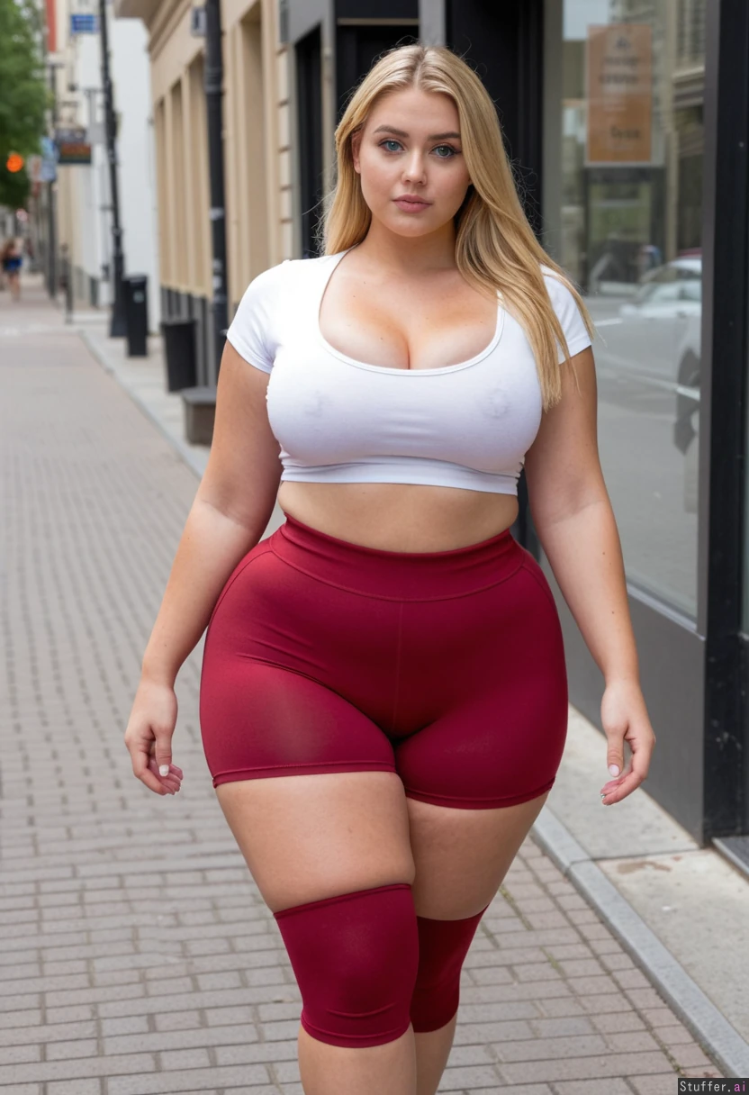 (Lazy 20 year old supermodel, ultra thin face, Dutch, blue eyes, eyeliner, blonde hair, instagram model) (Tight wine_red spandex short shorts, white crop top,) (Curvy), (huge rounded wide hips, thick thighs, tight cleavage), sexy, ((Street, walking front view, full body view ))