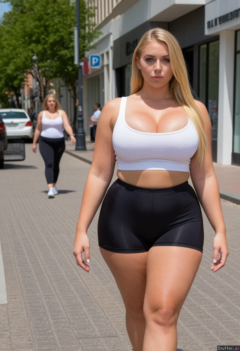 (Lazy 20 year old supermodel, ultra thin face, Dutch, blue eyes, eyeliner, blonde hair, instagram model, ((attractive facial features:1.9)), bright light long blonde hair, gorgeous face, defined jawline) (Tight black spandex shorts, white crop top,) (Curvy), (massive huge rounded wide hips, big thick thighs, tight cleavage), sexy, ((Street, walking front view, full body view ))