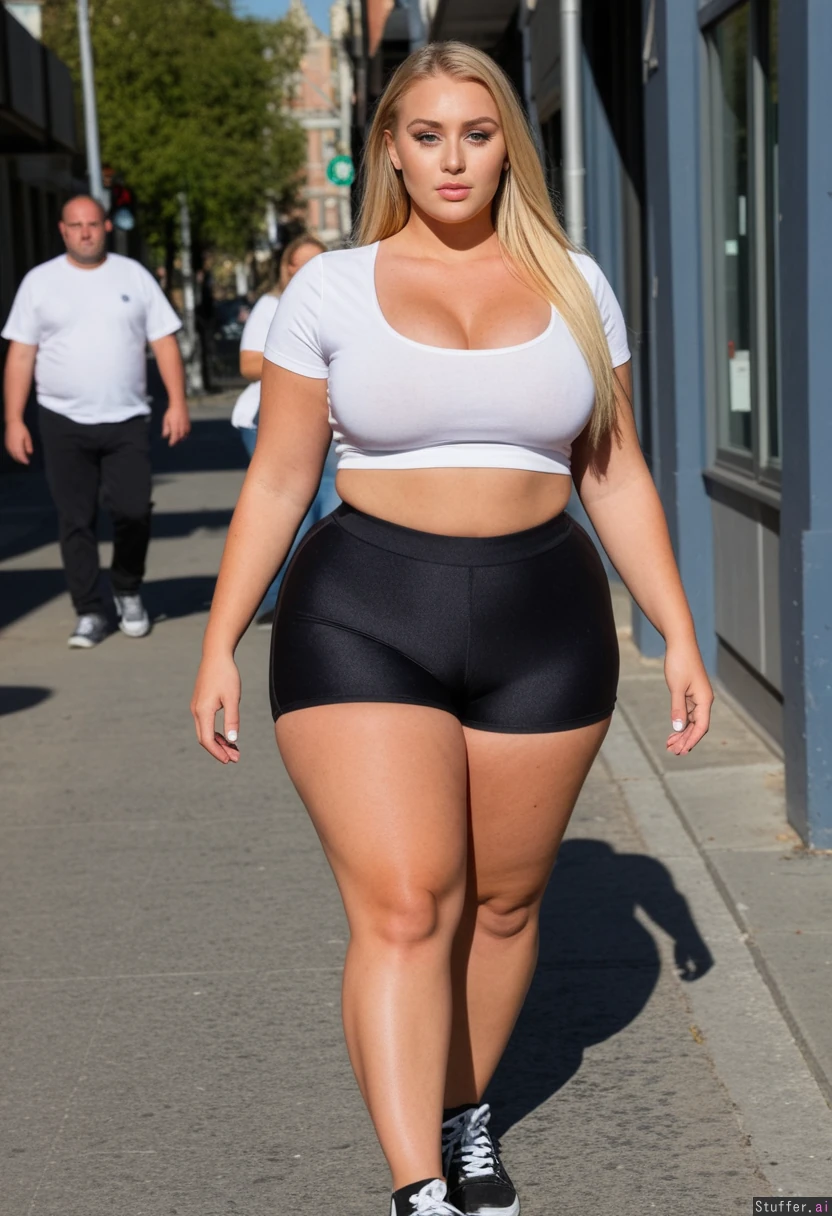 (Lazy 20 year old supermodel, ultra thin face, Dutch, blue eyes, eyeliner, blonde hair, instagram model, ((attractive facial features:1.9)), bright light long blonde hair, gorgeous face, defined jawline) (Tight black spandex shorts, white crop top,) (Curvy), (massive huge rounded wide hips, big thick thighs, tight cleavage), sexy, ((Street, walking front view, full body view ))