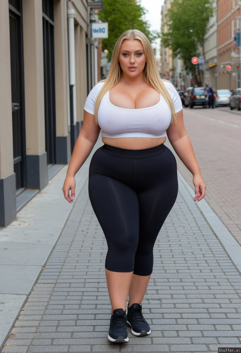 (Lazy 20 year old supermodel, ultra thin face, Dutch, blue eyes, eyeliner, blonde hair, instagram model, ((attractive facial features:1.9)), bright light long blonde hair, gorgeous face, defined jawline) (Tight black spandex shorts, white crop top,) (Curvy), (massive huge rounded wide hips, big thick thighs, tight cleavage), sexy, ((Street, walking front view, full body view ))