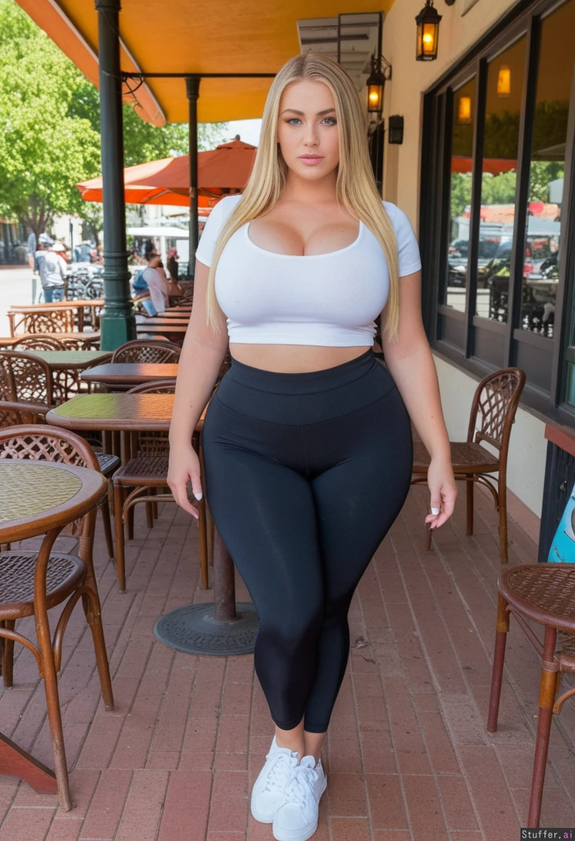 (Lazy 20 year old supermodel, ultra thin face, Dutch, blue eyes, eyeliner, blonde hair, instagram model, ((attractive facial features:1.9)), bright light long blonde hair, gorgeous face, defined jawline) (Tight black spandex shorts, white crop top,) (Curvy), (massive huge rounded wide hips, big thick thighs, tight cleavage), sexy, ((Outdoor cafe, standing front view, full body view ))