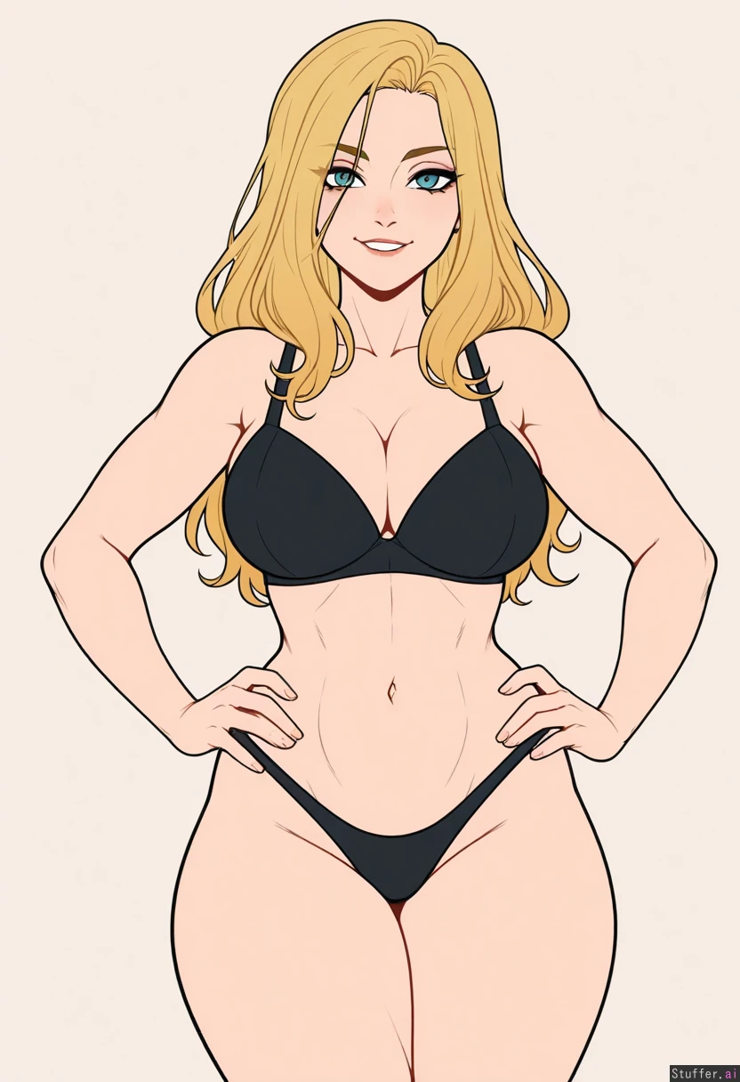 (Kinkymation(artist):0.5), (pudgeruffian(artist):0.3), Beige background, 1woman, milf, solo, (simple style), ((less detail)), ((flat colors)), blonde hair, long hair, bangs, round eyes, blue eyes, eye liner, cute face, looking at viewer, smiling, light skin, hands on hips, biting lip ((slim)), toned belly, (Athletic build), fit figure, ((skinny)), midriff Black bra, black thong Modest boobs, ((eyes open)),