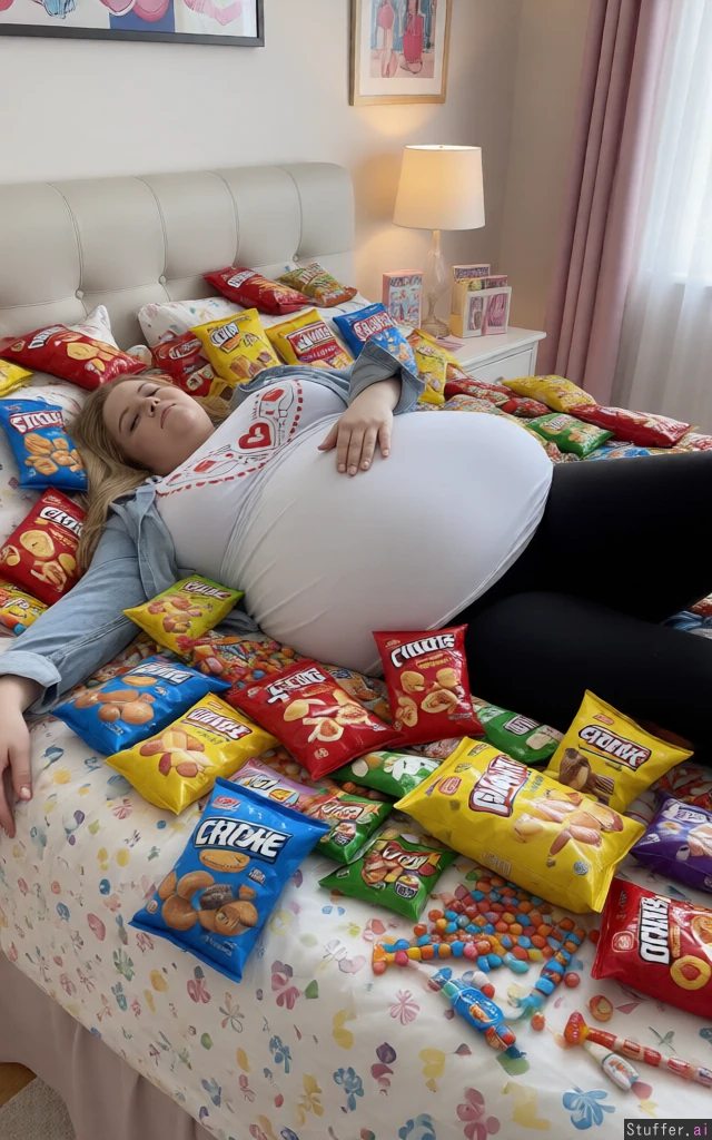 Make her lie totally overeat on a queen size bed covered with snacks and candy bags in a girls room, zoom in