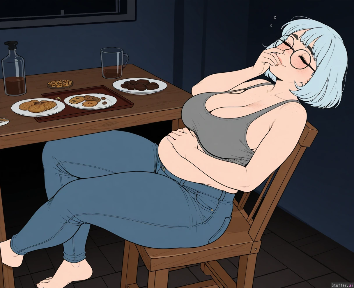 ((artist)), ((simple style)), (less detail), ((flat colors)), color, tall woman, 1girl, (dark room), bedroom, (sagging breasts), (large breasts:1.1), cleavage, (Sitting up on wooden chair), (plates of chocolate donuts and cookies on table:1.25), leaning back, (next to table), (side view), looking down, head back, (Hand over mouth), crumbs, hand on belly, (Grey tanktop), (low rise jeans), barefoot, ((Light_blue hair), wavy bob, medium hair, bangs), round glasses, face, (face freckles), (body freckles), cute round black eyes, ((eyes closed)), nice eyelashes, eyeshadow, (double chin), (thick thighs:1.25), thin, slim body, Spft cheeks, blushing, round face, low brow, bored, ((tired)), (luscious big lips), (smile)
