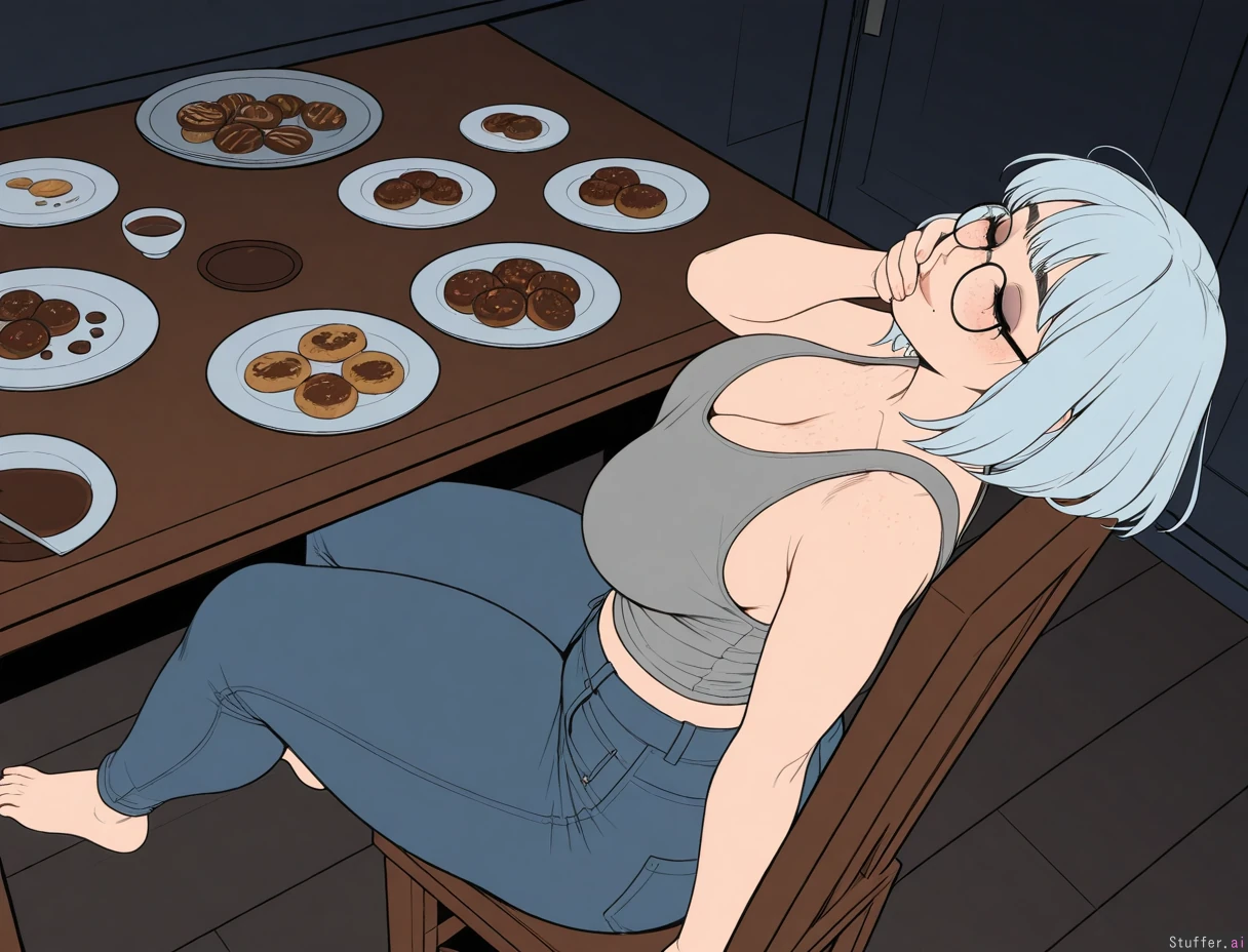 ((artist)), ((simple style)), (less detail), ((flat colors)), color, tall woman, 1girl, (dark room), bedroom, (sagging breasts), (large breasts:1.1), cleavage, (Sitting on wooden chair), (plates of chocolate donuts and cookies on table:1.25), leaning back, (next to table), (side view), looking up, head back, (Hand over mouth), crumbs, (Grey tanktop), (low rise jeans), barefoot, ((Light_blue hair), wavy bob, medium hair, bangs), round glasses, face, (face freckles), (body freckles), cute round black eyes, ((eyes closed)), nice eyelashes, eyeshadow, (double chin), (thick thighs:1.25), thin, slim body, Spft cheeks, blushing, round face, low brow, bored, ((tired)), (luscious big lips), (smile)