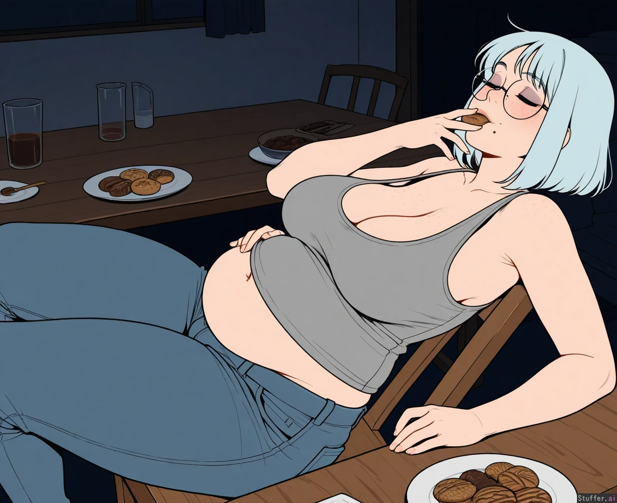 ((artist)), ((simple style)), (less detail), ((flat colors)), color, tall woman, 1girl, (dark room), bedroom, (sagging breasts), (large breasts:1.1), cleavage, (Sitting up on wooden chair), (plates of chocolate donuts and cookies on table:1.25), leaning back, (next to table), (side view), looking down, head back, (Hand hanging cookie over mouth), crumbs, hand on belly, (Grey tanktop), (low rise jeans), ((Light_blue hair), wavy bob, medium hair, bangs), round glasses, face, (face freckles), (body freckles), cute round black eyes, ((eyes closed)), nice eyelashes, eyeshadow, (double chin), (thick thighs:1.25), thin, slim body, Chubby cheeks, blushing, round face, low brow, bored, ((tired)), (luscious big lips), (smile open wide)