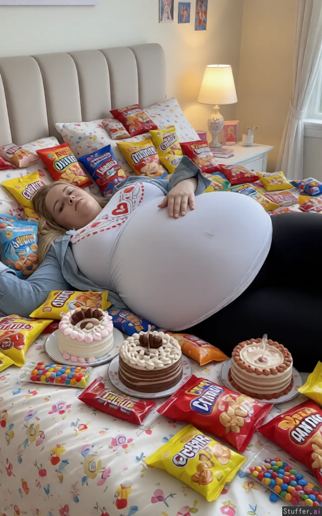 Make her lie totally overeat on a queen size bed covered with snacks, cake and candy bags in a girls room, zoom in, her belly is ultra stuffed