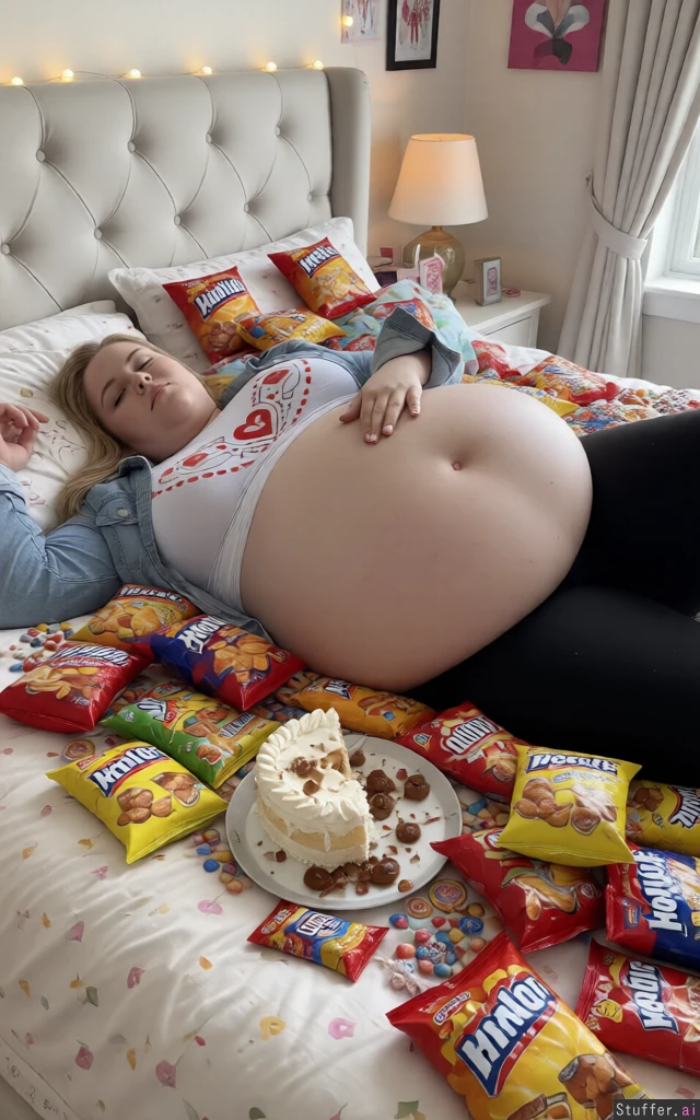 Make her lie totally overeat on a queen size bed covered with snacks, hqlf eaten cake and candy bags in a girls room, zoom in, her belly is ultra stuffed