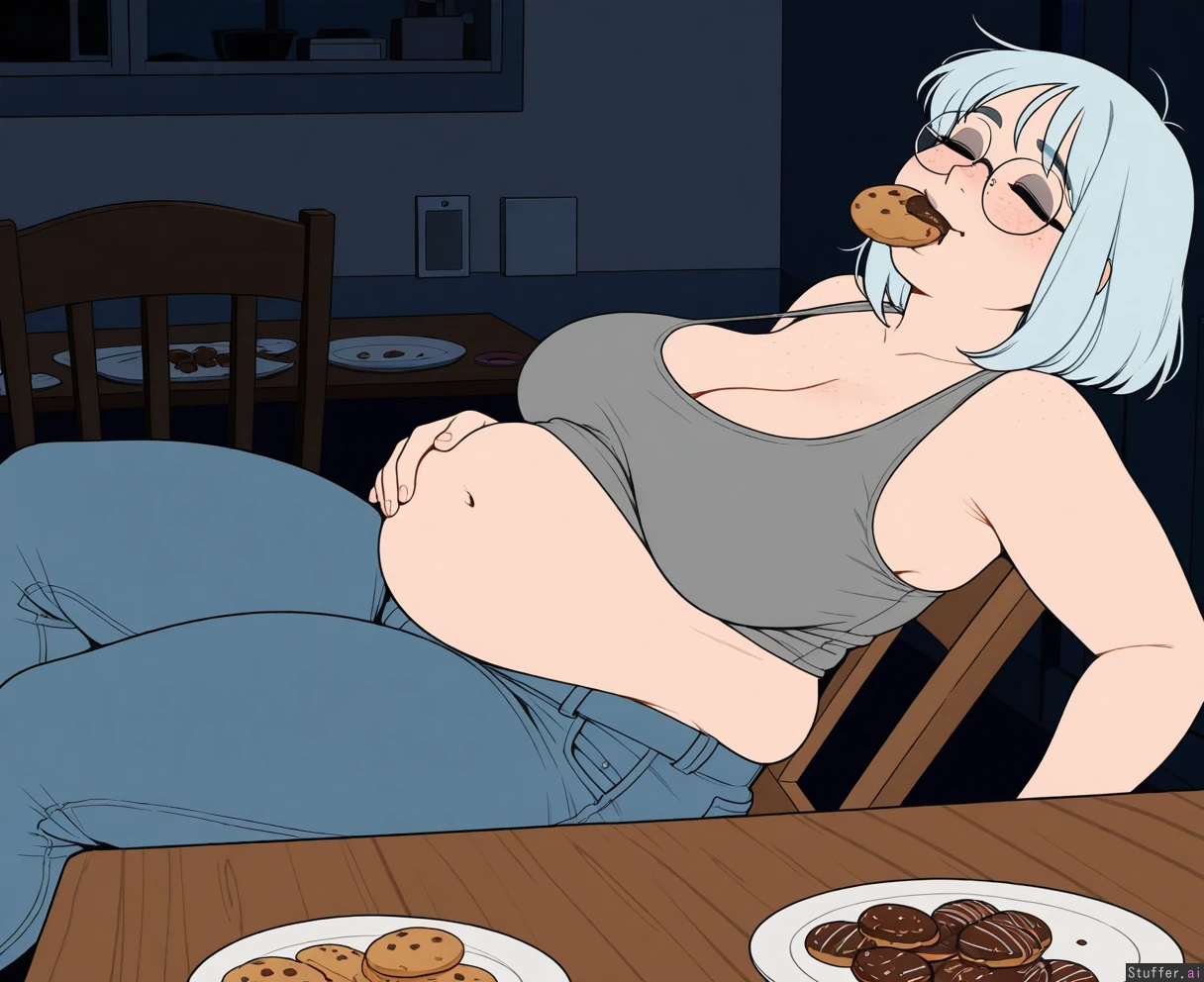 ((artist)), ((simple style)), (less detail), ((flat colors)), color, tall woman, 1girl, (dark room), bedroom, (sagging breasts), (large breasts:1.1), cleavage, (Sitting up on wooden chair), (plates of chocolate donuts and cookies on table:1.25), leaning back, (next to table), (side view), looking down, head back, (Holding cookie in mouth), crumbs, hand on belly, (Grey tanktop), (low rise jeans), ((Light_blue hair), wavy bob, medium hair, bangs), round glasses, face, (face freckles), (body freckles), cute round black eyes, ((eyes closed)), nice eyelashes, eyeshadow, (double chin), (thick thighs:1.25), big belly, Chubby cheeks, blushing, round face, low brow, bored, ((tired)), (luscious big lips), (smile open wide)