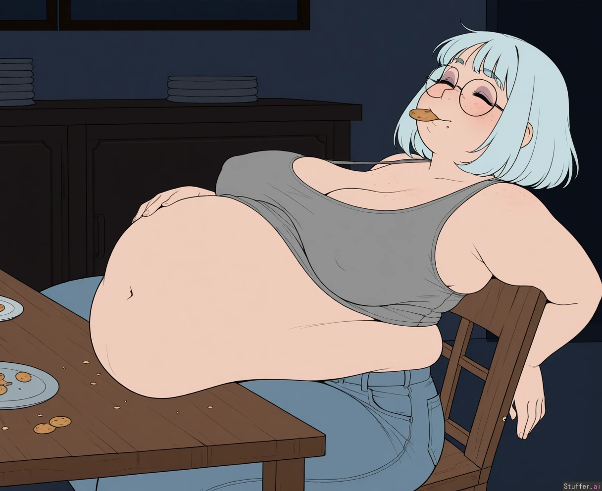 ((artist)), ((simple style)), (less detail), ((flat colors)), color, tall woman, 1girl, (dark room), bedroom, ((sagging breasts)), erect nipples, (large breasts:1.1), cleavage, (Sitting up on wooden chair), (empty plates with crumbs on table:1.25), leaning back, (next to table), (side view), looking down, head back, (Holding cookie in mouth), crumbs, hand on belly, (Grey tanktop), (low rise jeans), ((Light_blue hair), wavy bob, medium hair, bangs), round glasses, face, (face freckles), (body freckles), cute round black eyes, ((eyes closed)), nice eyelashes, eyeshadow, (double chin), (thick thighs:1.25), (hyper belly), (belly expansion), (overweight), (Chubby cheeks), blushing, round face, low brow, bored, ((tired)), (luscious big lips), (smile open wide)