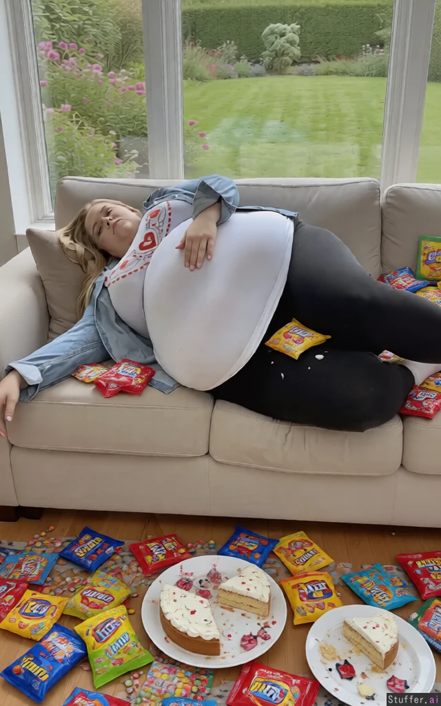 Put a lot of candy bags and half eaten cakes around her