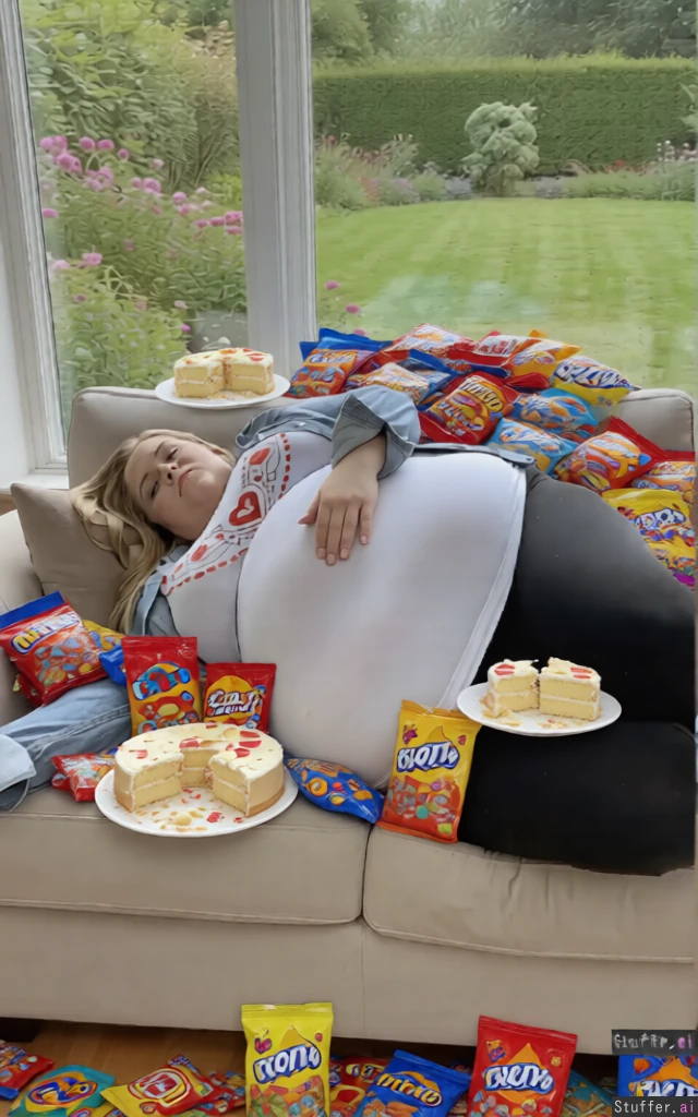Put a lot of candy bags and half eaten cakes around her