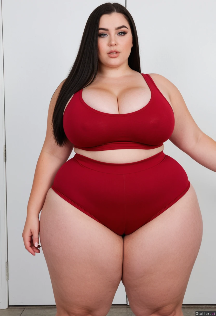 (20 year old supermodel, ultra thin face, Dutch, blue eyes, eyeliner, dyed jet_black hair) (Tight wine_red spandex short shorts, white crop top,) (Slim, ( huge rounded wide hips, thick thighs, tight cleavage), sexy, slim waist:1.6) ((Street, walking front view, full body view ))