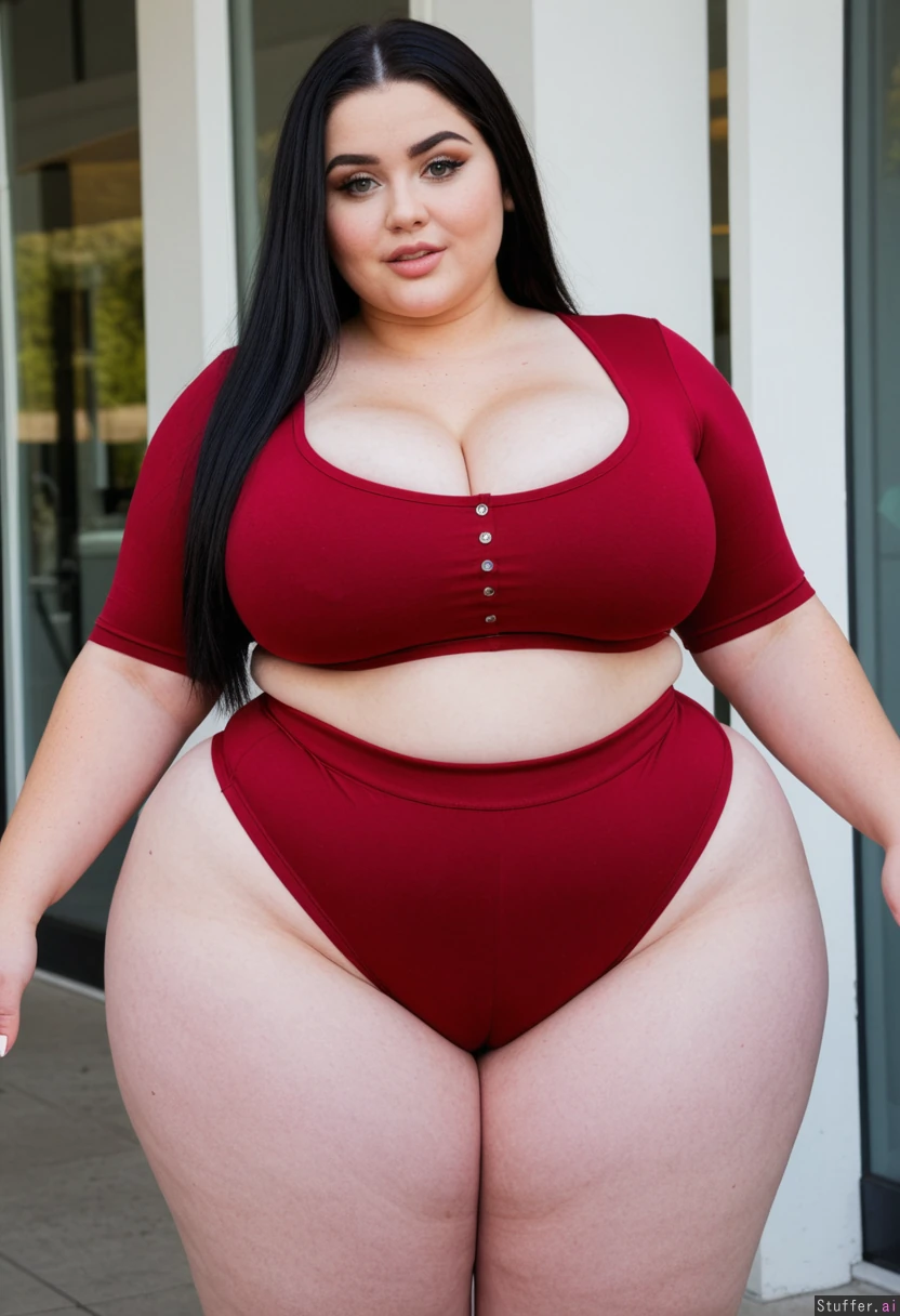 (20 year old supermodel, ultra thin face, Dutch, blue eyes, eyeliner, dyed jet_black hair) (Tight wine_red spandex short shorts, white crop top,) (Slim, ( huge rounded wide hips, thick thighs, tight cleavage), sexy, slim waist:1.6) ((Street, walking front view, full body view ))
