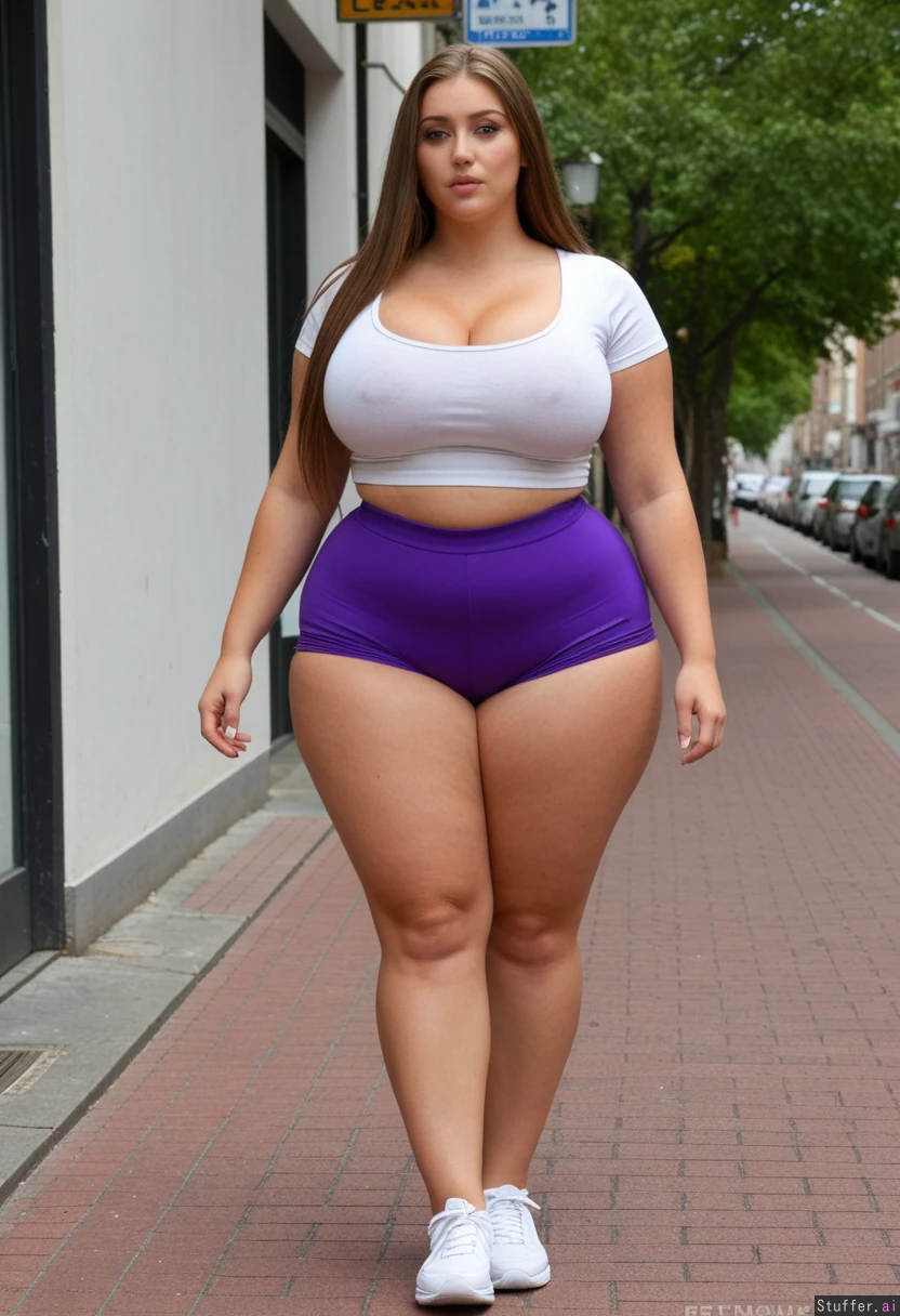 (20 year old supermodel, ultra thin face, Dutch, blue eyes, eyeliner, beautiful long hair) (Tight dark puplspandex short shorts, white crop top,) (Slim, ( huge rounded wide hips, thick thighs:1.5), (tight cleavage), sexy, (extremely hourglass waist:1.6) ((Street, walking side profile , full body view ))