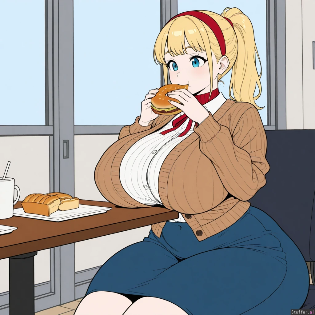 ((Flat colors)), solo, 1girl, (Covered navel, ribbed green long sleeve button sweater, brown cardigan, white long sleeve shirt, blue skirt, red neck ribbon, red hairband), Long blonde ponytail, blonde bangs, blue eyes, pale skin, short, (Sitting down next to table, eating donuts), mayor office, Skinny:2, thin:1, Huge breasts, huge boobs, huge hips, wide hips, hips_wider_than_shoulders, huge ass, huge butt, huge thighs,