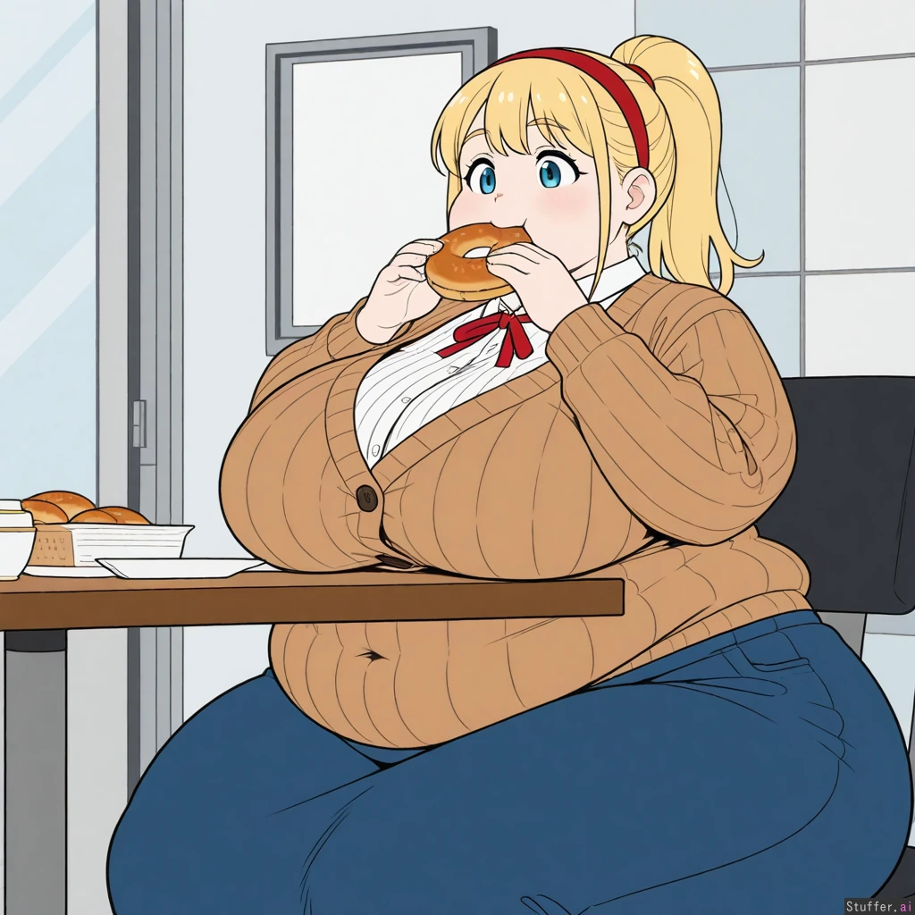 ((Flat colors)), solo, 1girl, (Covered navel, ribbed green long sleeve button sweater, brown cardigan, white long sleeve shirt, blue skirt, red neck ribbon, red hairband), Long blonde ponytail, blonde bangs, blue eyes, pale skin, short, (Sitting down next to table, eating donuts), mayor office, chubby:2.5, obese:0.5, (Fat round face, chubby arms), Huge breasts, huge boobs, huge hips, wide hips, hips_wider_than_shoulders, huge ass, huge butt, huge thighs,