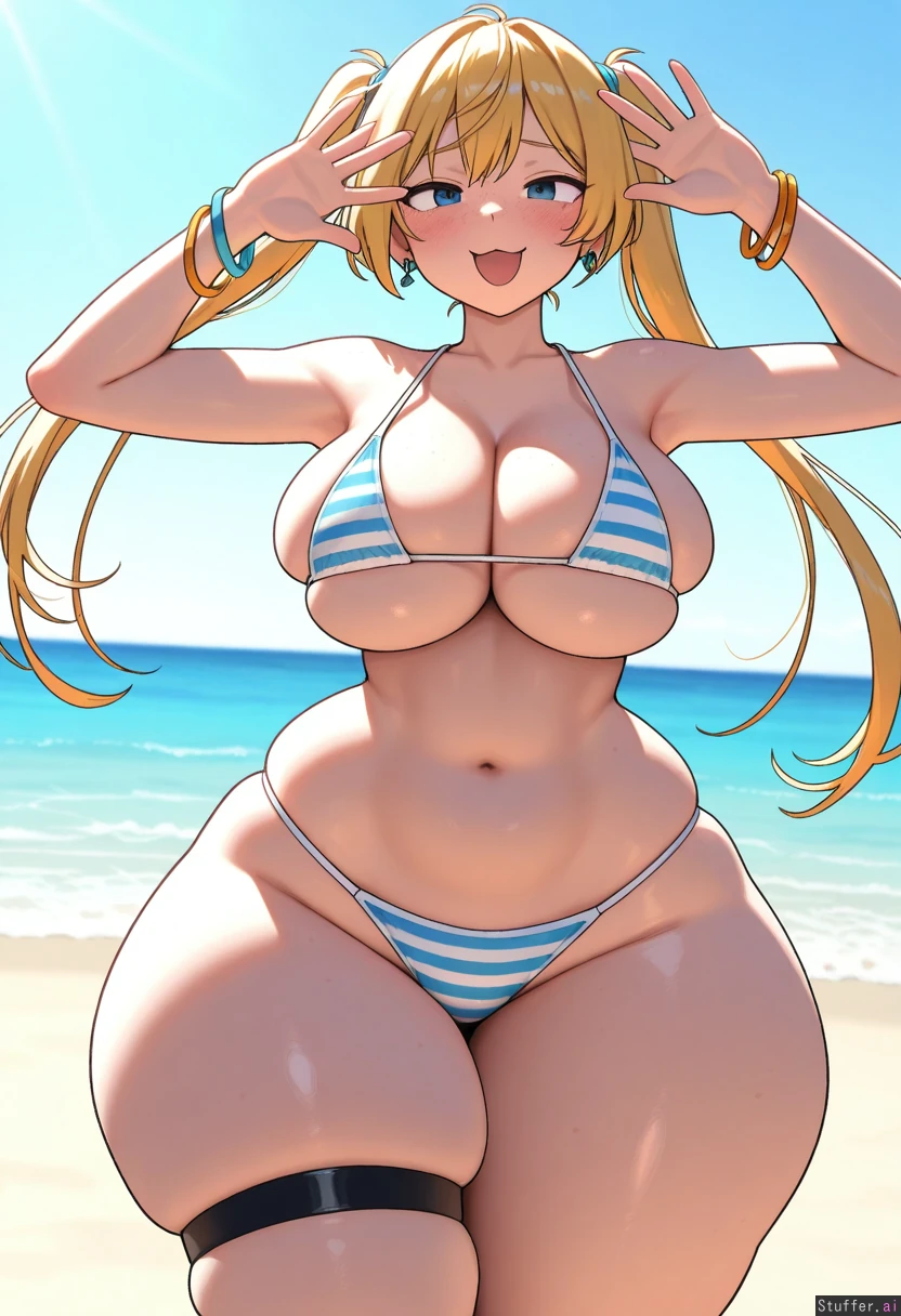 (aaaa(quad_a), (ohasi_art), w-oo-t(artist), (betterwithsalt), (((solo))), (((view from front))), (blonde hair), long hair, twintail hair, (((bright blue eyes))), excited, cute, beach, beach babe, standing, tight striped bikini, (((simple shading))), messy bangs 0:2, earring, half lidded eyes 0:3, (((blushing))), thin waist, (curvy body), bracelet, (((vibrant colors))), (((freckles))), ((skindentation)), (((dynamic lighting))), ((((huge wide hips, huge thighs)))), flat colors, ((huge ass))