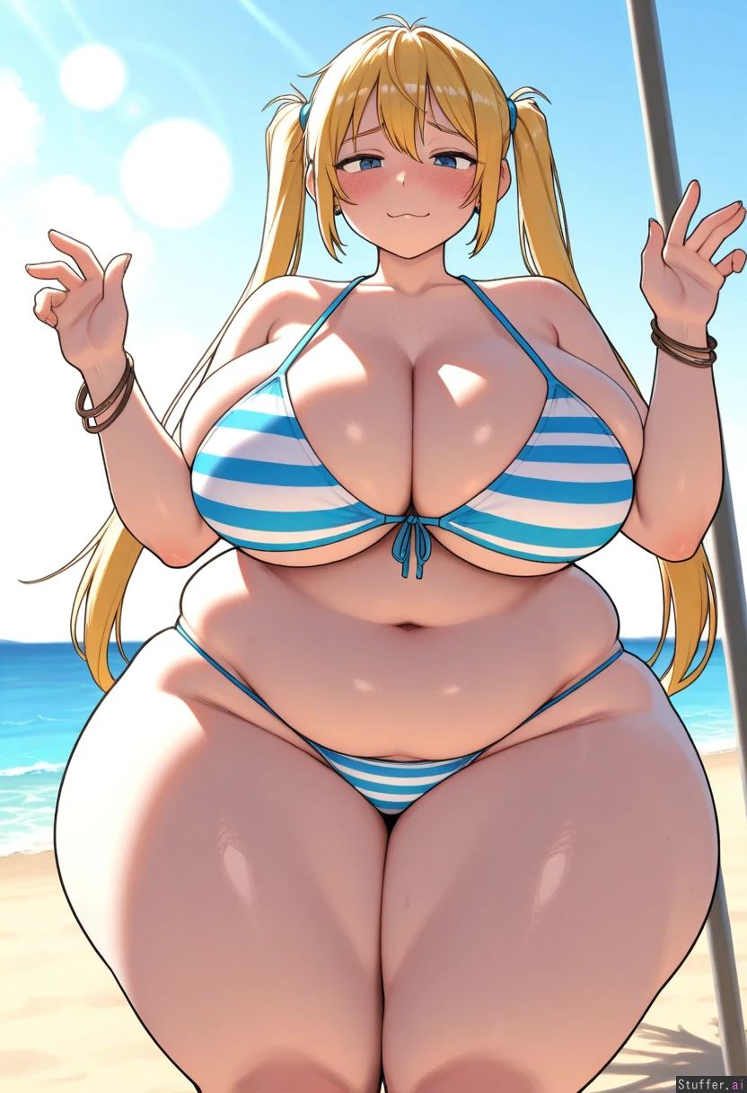 (aaaa(quad_a), (ohasi_art), w-oo-t(artist), (betterwithsalt), (((solo))), (((view from front))), (blonde hair), long hair, twintail hair, (((bright blue eyes))), excited, cute, beach, beach babe, standing, tight striped bikini, (((simple shading))), messy bangs 0:2, earring, half lidded eyes 0:3, (((blushing))), thin waist, (curvy body), bracelet, (((vibrant colors))), (((freckles))), ((skindentation)), (((dynamic lighting))), ((((huge wide hips, huge thighs)))), flat colors, ((huge ass)), ((((obese)))
