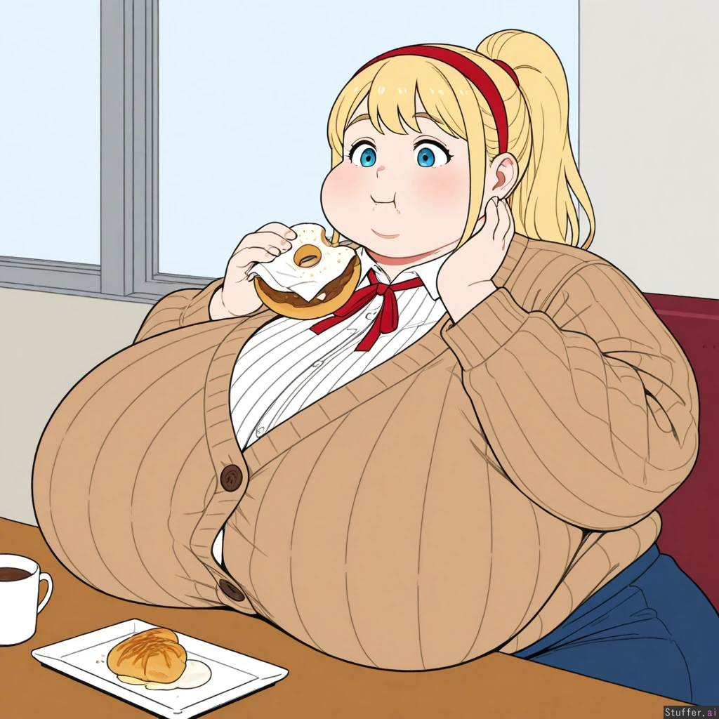 ((Flat colors)), solo, 1girl, (Covered navel, ribbed green long sleeve button sweater, brown cardigan, white long sleeve shirt, blue skirt, red neck ribbon, red hairband), Long blonde ponytail, blonde bangs, blue eyes, pale skin, short, (Sitting down next to table, eating donuts), mayor office, morbidly_obese:3, immobile:2, ((Fat round face, double chin, chubby cheeks, fat arms)), Gigantic breasts, gigantic boobs, gigantic hips, wide hips, hips_wider_than_shoulders, gigantic ass, gigantic butt, gigantic thighs,