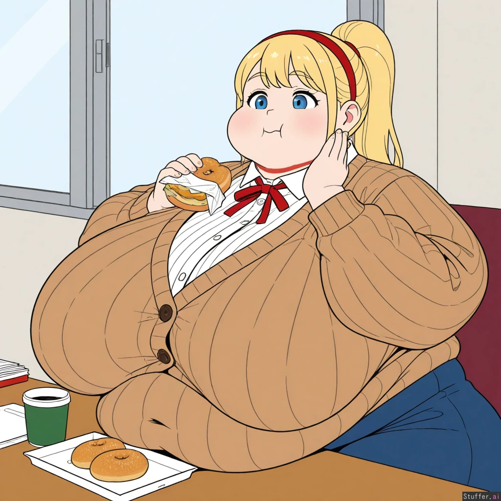 ((Flat colors)), solo, 1girl, (Covered navel, ribbed green long sleeve button sweater, brown cardigan, white long sleeve shirt, blue skirt, red neck ribbon, red hairband), Long blonde ponytail, blonde bangs, blue eyes, pale skin, short, (Sitting down next to table, eating donuts), mayor office, morbidly_obese:3, immobile:2, ((Fat round face, double chin, chubby cheeks, fat arms)), Gigantic breasts, gigantic boobs, gigantic hips, wide hips, hips_wider_than_shoulders, gigantic ass, gigantic butt, gigantic thighs, gigantic double belly