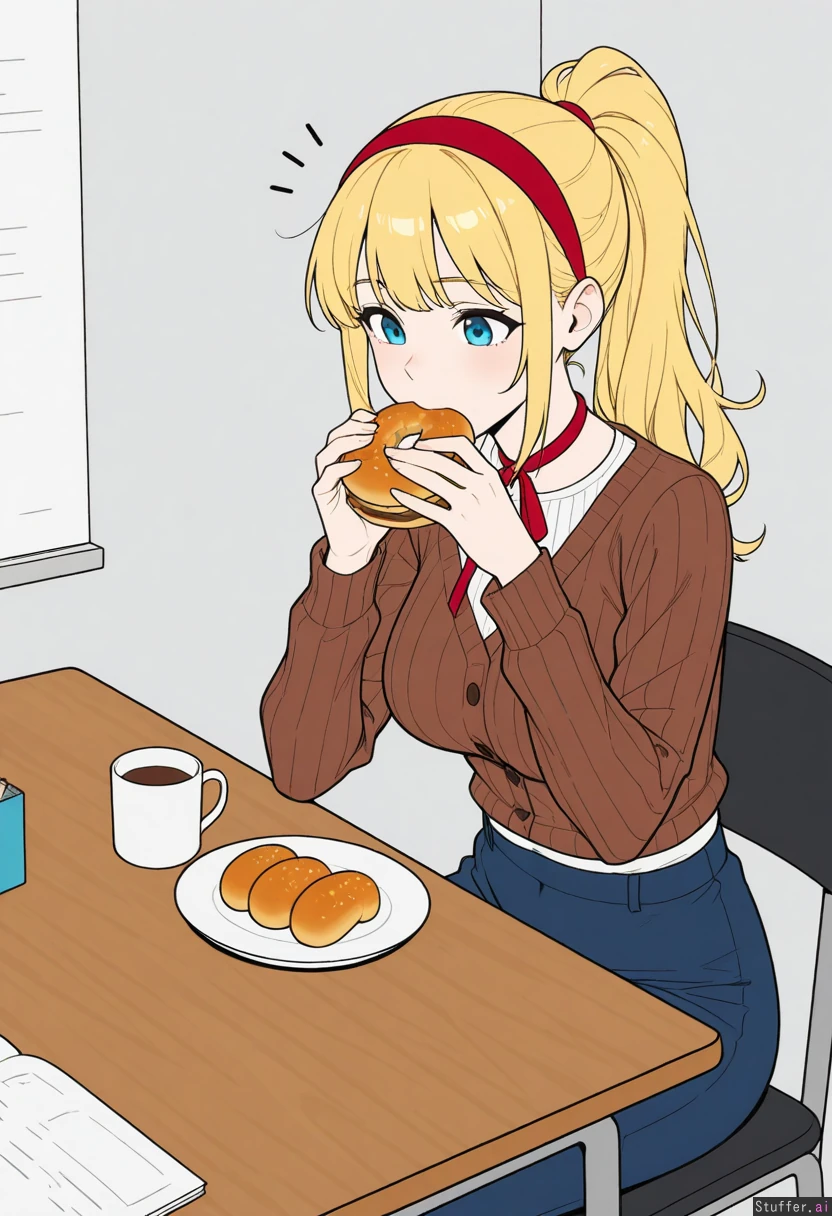 ((Flat colors)), solo, 1girl, (Covered navel, ribbed green long sleeve button sweater, brown cardigan, white long sleeve shirt, blue skirt, red neck ribbon, red hairband), tight clothes, Long blonde ponytail, blonde bangs, blue eyes, pale skin, short, (Sitting down next to table, eating donuts), mayor office, Skinny:2, thin:1, hips_wider_than_shoulders, boobheavy:2, assheavy:2