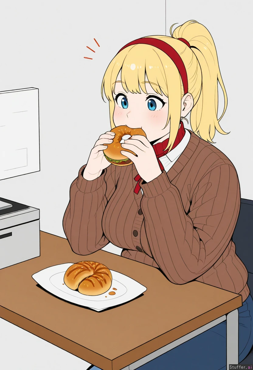 ((Flat colors)), solo, 1girl, (Covered navel, ribbed green long sleeve button sweater, brown cardigan, white long sleeve shirt, blue skirt, red neck ribbon, red hairband), tight clothes, Long blonde ponytail, blonde bangs, blue eyes, pale skin, short, (Sitting down next to table, eating donuts), mayor office, thin:0.5, chubby:2.5, Chubby round face, chubby arms, hips_wider_than_shoulders, boobheavy:2, assheavy:2