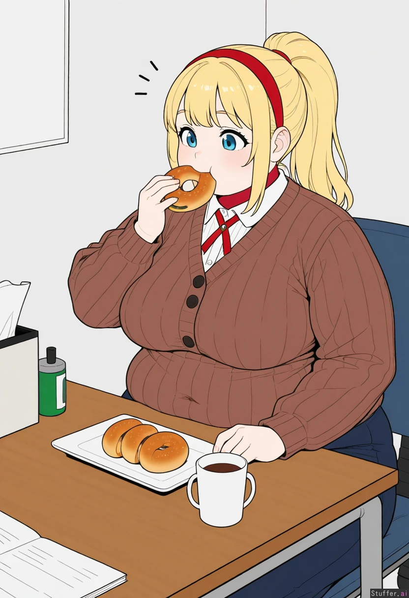 ((Flat colors)), solo, 1girl, (Covered navel, ribbed green long sleeve button sweater, brown cardigan, white long sleeve shirt, blue skirt, red neck ribbon, red hairband), tight clothes, Long blonde ponytail, blonde bangs, blue eyes, pale skin, short, (Sitting down next to table, eating donuts), mayor office, chubby:2.8,obese:0.2 Chubby round face, chubby arms, hips_wider_than_shoulders, boobheavy:2, assheavy:2