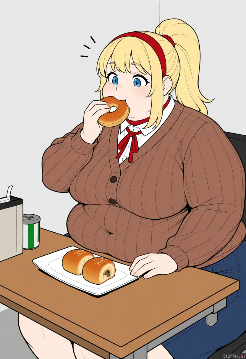 ((Flat colors)), solo, 1girl, (Covered navel, ribbed green long sleeve button sweater, brown cardigan, white long sleeve shirt, blue skirt, red neck ribbon, red hairband), tight clothes, Long blonde ponytail, blonde bangs, blue eyes, pale skin, short, (Sitting down next to table, eating donuts), mayor office, morbidly_obese:3, immobile, Fat round face, fat arms, hips_wider_than_shoulders, boobheavy:2, assheavy:2