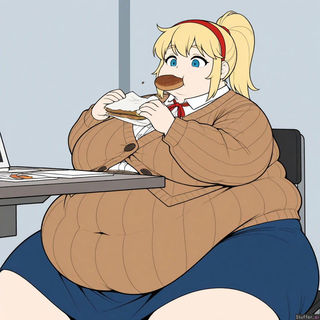 ((Flat colors)), solo, 1girl, (Covered navel, ribbed green long sleeve button sweater, brown cardigan, white long sleeve shirt, blue skirt, red neck ribbon, red hairband), tight clothes, Long blonde ponytail, blonde bangs, blue eyes, pale skin, short, (Sitting down next to table, eating donuts), mayor office, (((Morbidly_obese, immobile))), Fat round face, fat arms, Hips_wider_than_shoulders, ((boobheavy, assheavy))