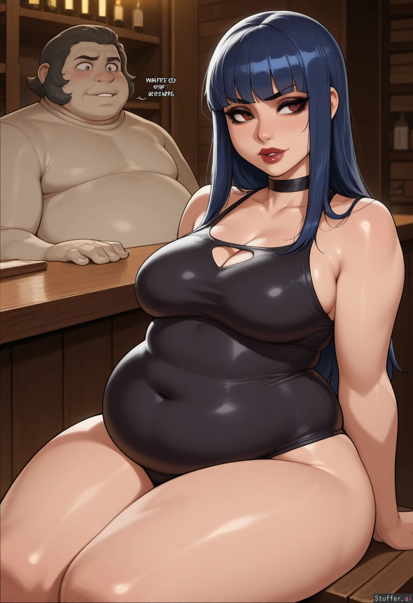 Naked (solo person) both hands on bely, sitting at the bar talking to friends about how far she is (nyantcha:1.3), (krekkov:1.2), (reiq:1.1), (kittew :1.1), (tall) 8k, high resolution, full resolution, maximum pixel density, best quality, proportional, masterpiece, highly detailed, flawless, high rating, highly detailed and chubby face. ((fat arms))fat back, detailed fat abdomen structure, ,extra wide fat waist, extra wide hips, fat legs, very thick thighs, large wide fat belly rolls, thick love handles, large long hyper inflated low hanging belly, (((medium breast))) goth skin complexion,one ((chubby goth woman:1.5)) ((long messy dark blue hair)) ((thick black eyeliner)) ((Amber eyes)) (long defined lashes, softly arched eyebrows, straight refined nose, full lips, bold dark red lipstick, composed confident expression, slightly parted lips, elegant neck relaxed shoulders, ((chubby face:1)) ((chubby upper bod:1.4))