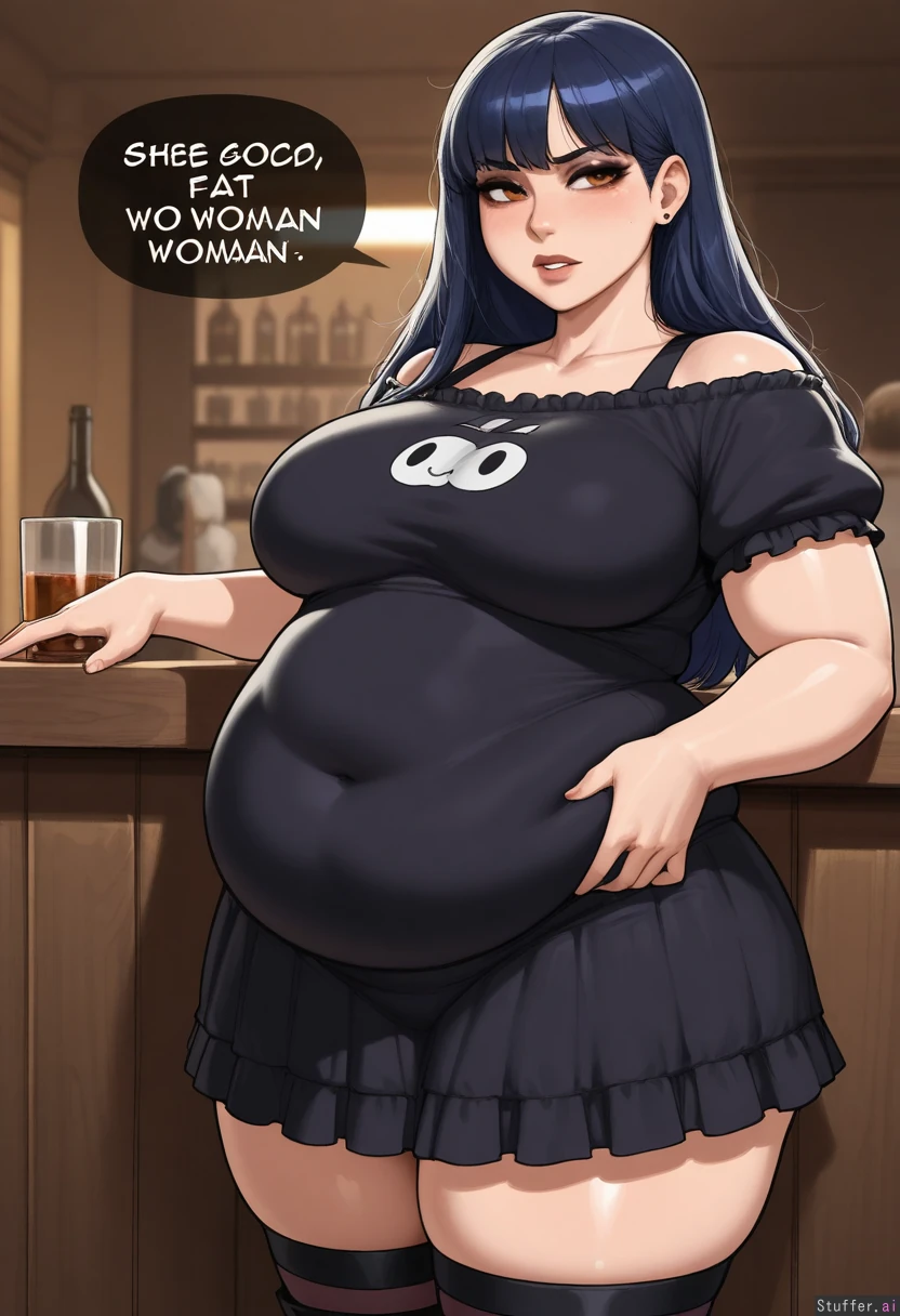 In a cold mountain bar both hands on bely, standing at the bar talking to friends wearing black boots and ripped pants, she is talking about how fat she is (nyantcha:1.3), (krekkov:1.2), (reiq:1.1), (kittew :1.1), (tall) 8k, high resolution, full resolution, maximum pixel density, best quality, proportional, masterpiece, highly detailed, flawless, high rating, highly detailed and chubby face. ((fat arms))fat back, detailed fat abdomen structure, ,extra wide fat waist, extra wide hips, fat legs, very thick thighs, large wide fat belly rolls, thick love handles, large long hyper inflated low hanging belly, (((medium breast))) goth skin complexion,one ((chubby goth woman:1.8)) ((long messy dark blue hair)) ((thick black eyeliner)) ((Amber eyes)) (long defined lashes, softly arched eyebrows, straight refined nose, full lips, bold dark red lipstick, composed confident expression, slightly parted lips, elegant neck relaxed shoulders, ((chubby face:1)) ((chubby upper bod:1.4)) (drunk, disappointed, frustrated, exhausted , worried, surprised, angry, concerned:1.4),
