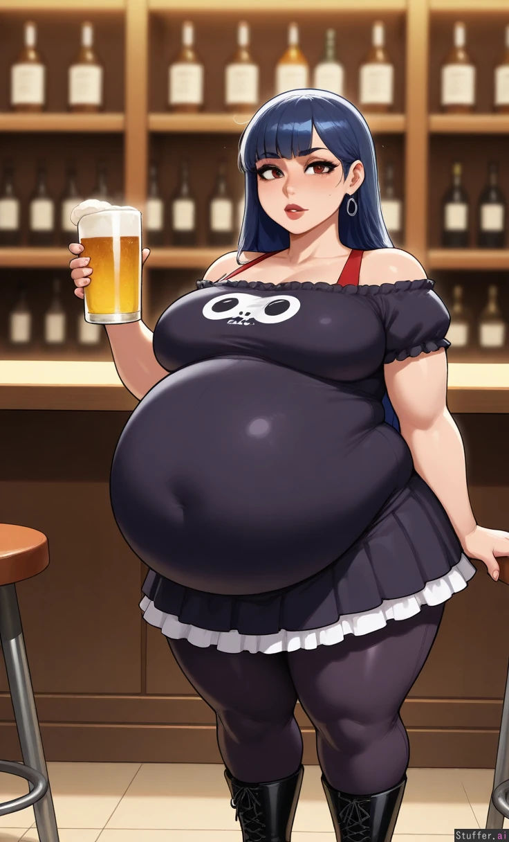 In a warm mountain bar , she is drinking a beer standing at the bar talking to friends wearing black boots and ripped pants, red top, she is talking about how fat she is (nyantcha:1.3), (krekkov:1.2), (reiq:1.1), (kittew :1.1), (tall) 8k, high resolution, full resolution, maximum pixel density, best quality, proportional, masterpiece, highly detailed, flawless, high rating, highly detailed and chubby face. ((fat arms))fat back, detailed fat abdomen structure, ,extra wide fat waist, extra wide hips, fat legs, very thick thighs, large wide ((fat belly rolls)) ((hyper inflated huge belly)) thick love handles, large long hyper inflated low hanging belly, (((medium breast))) goth skin complexion,one ((chubby goth woman:1.8)) ((long_messy_dark_blue hair)) ((thick black eyeliner)) ((Amber eyes)) (long defined lashes, softly arched eyebrows, straight refined nose, full lips, bold dark red lipstick, composed confident expression, slightly parted lips, elegant neck relaxed shoulders, ((chubby face:1)) ((chubby upper bod:1.4)) (drunk, disappointed, frustrated, exhausted , worried, surprised, angry, concerned:1.4),